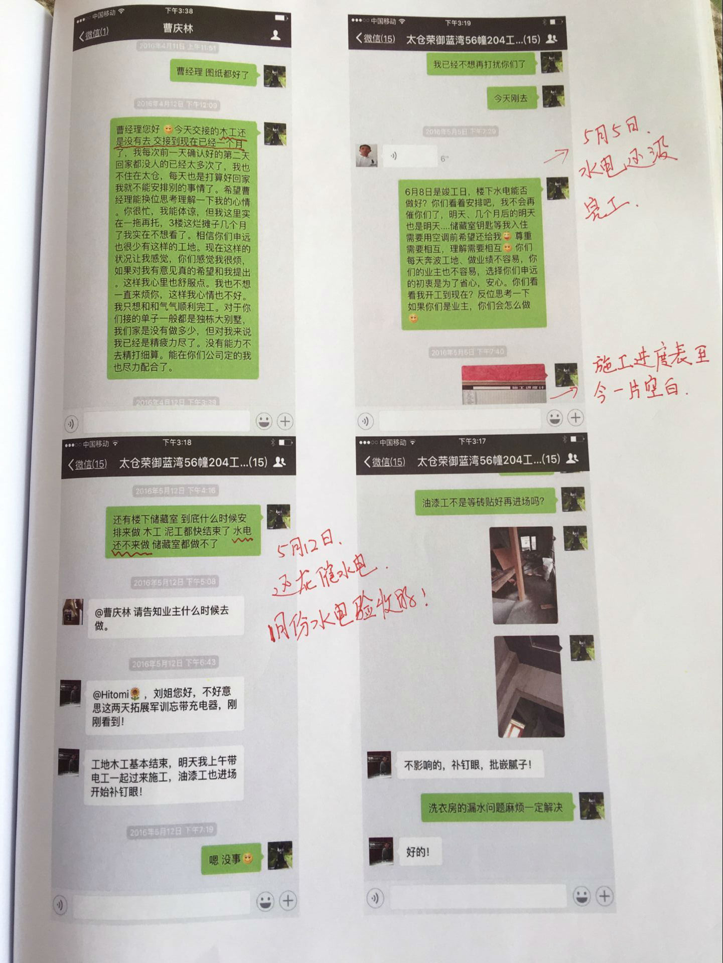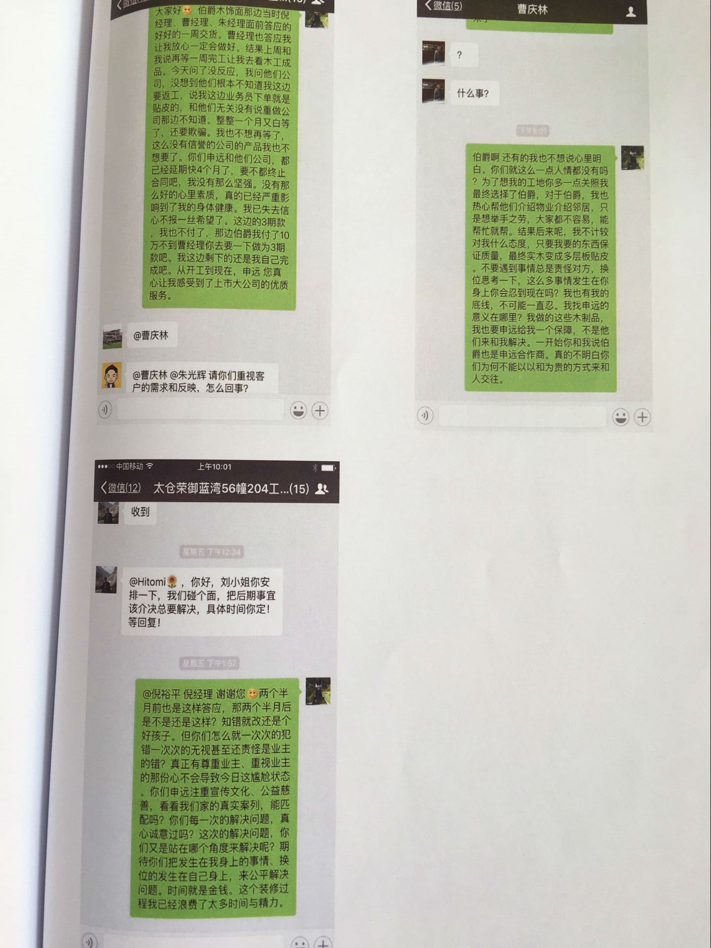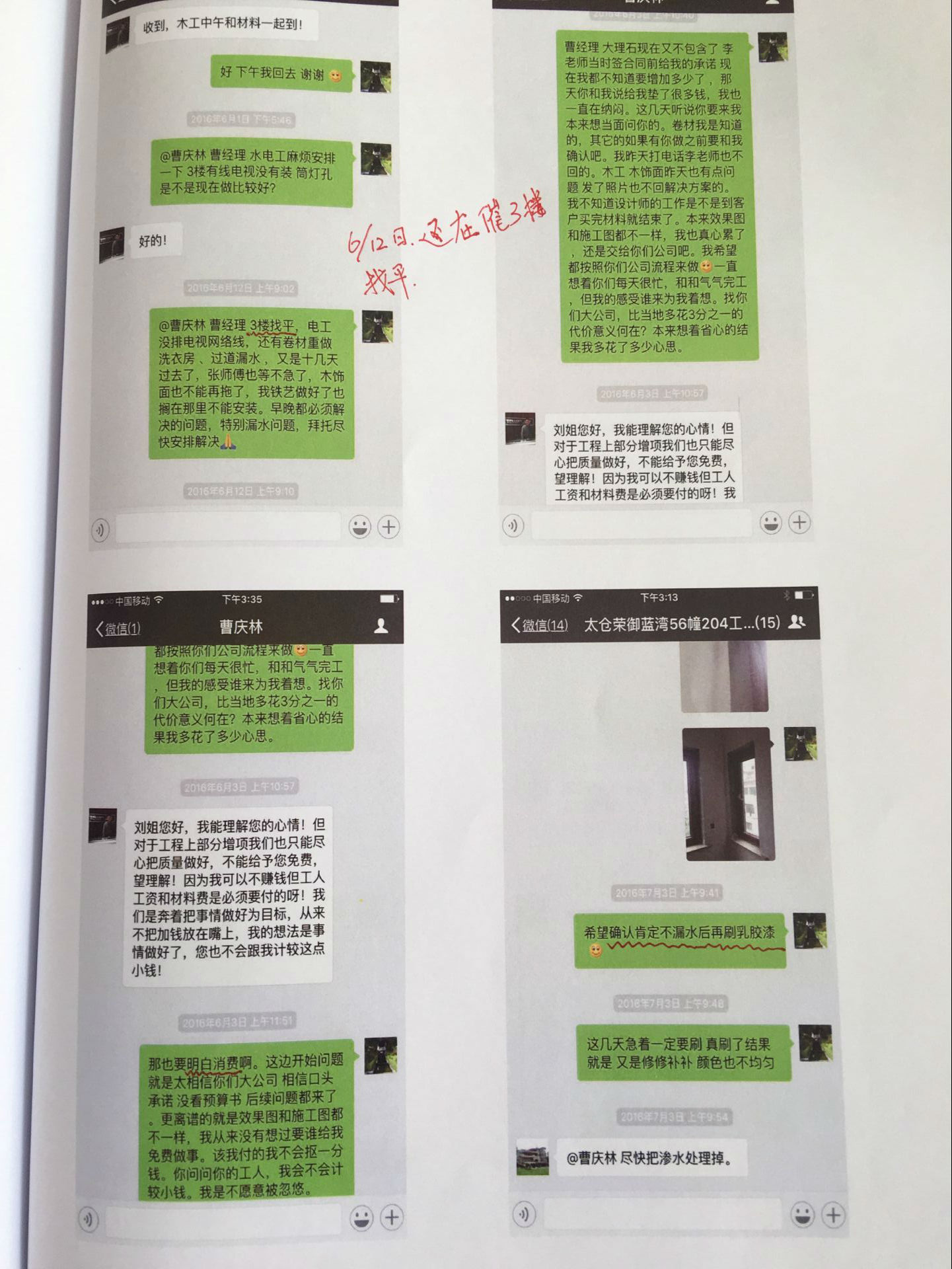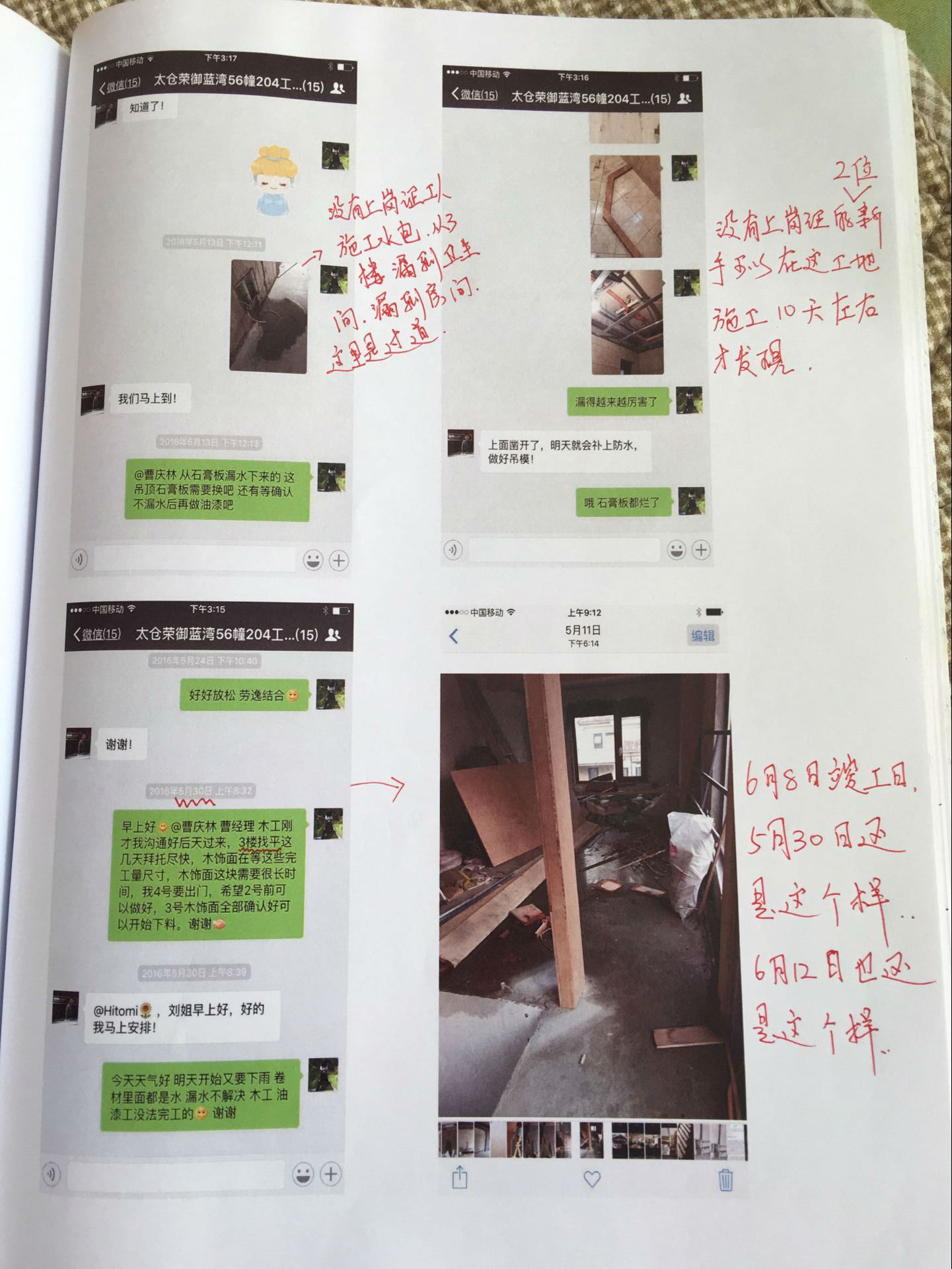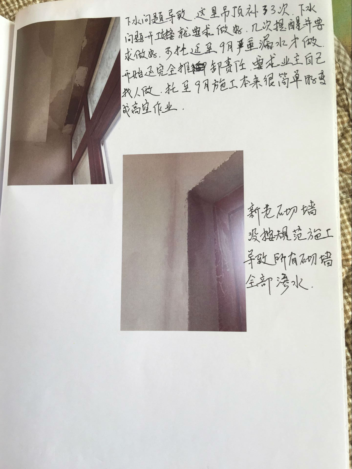 我和申*2015年11月簽下合同,6月8號竣工,可一拖再拖至今乳膠漆未刷。解決問題太以公司利益出發(fā),明知自己責(zé)任能推則推。新老砌墻沒按照規(guī)范施工導(dǎo)致嚴(yán)重滲水,開始要求業(yè)主自己外面找人修的,一樣以后一切漏水與申*無關(guān)了。最后雙方各承擔(dān)一半責(zé)任,外立面新砌墻不做防水預(yù)算應(yīng)該嗎?沒做預(yù)算應(yīng)該告知業(yè)主需要做吧,直至外墻嚴(yán)重滲水才知道這么重要的砌外墻施工太太馬虎,還推卸責(zé)任。買基本尺寸420寬馬桶都放不下,返工材料也由業(yè)主承擔(dān)。施工圖和效果圖不一致。入戶進(jìn)門、樓梯儲藏間照明都沒有。20平方左右的客臥最終才發(fā)現(xiàn)放衣柜地方?jīng)]有留(床背景和吊頂限制了床的位置)開工到現(xiàn)在施工流程基本和申遠(yuǎn)宣傳的施工流程不搭邊。合同承諾的閉口合同,合同內(nèi)所包含的,都是陷阱。項目經(jīng)理介紹的木飾面廠家,把我合同上的美國進(jìn)口紅橡做成多層板貼皮的了。答應(yīng)返工卻又失信白等了一個多月。這11月的裝修過程太多離譜問題已經(jīng)嚴(yán)重身心疲憊了。尊敬的申*領(lǐng)導(dǎo)們:   你們好!我是太倉景瑞藍(lán)灣業(yè)主,2015年11月2日,我滿懷欣喜與申*簽下了裝修施工合同,合同價31.5萬元。當(dāng)時設(shè)計師多次聲明是閉口合同,只要業(yè)主不改變方案就不會有增項故合同總價肯定不會增加。既然是閉口價,再加上對申*和設(shè)計師的信任,所以也就沒有慎重核實合同及預(yù)算表。輕信了設(shè)計師的口頭承諾就簽下合同了(這是我自己的責(zé)任)。結(jié)果多次聲明合同價內(nèi)包括的由木工現(xiàn)場定制的衣帽間和鞋柜柜體預(yù)算里不含了(四十五平方,價值2.9萬元),大理石、沐浴房有3個,但是預(yù)算只有兩個,窗臺是沒有了。開工當(dāng)天就開始增項。什么敲墻、丟垃圾都不在合同預(yù)算內(nèi)。目前還不清楚到底還有多少不在預(yù)算之內(nèi)。因為至今還沒有看到我的增減項。(7月我就要求過公司核實增減項目的)不知道是什么理由拖延至今日。不交給業(yè)主明細(xì)單,不遵守承諾欺騙業(yè)主還反問:“把你賣了你都不知道?。俊毕胂胧亲约禾煺媪?。白紙黑字才是真還好有錄音。到最后和我說以后設(shè)計方面問題來找我,其它問題不要找我,我納悶了,我這合同可是和您簽訂的,預(yù)算部也是由您吩咐照做的,怎么又沒責(zé)任了。再看圖紙,多處施工圖與效果圖不一致??蛷d確認(rèn)好的背景造型,效果圖也都是放電視柜,可施工圖卻還是個壁爐。兩間臥房的吊頂、背景都出錯,出錯后過來交接又沒有想周全,所以導(dǎo)致一樓房間吊頂變成平頂。很大的客臥連衣櫥的位置都沒留,因為床總要跟著床頭背景和吊頂走。施工圖您讓學(xué)生做可以理解,但您總要審核后交給施工隊吧?拿著施工圖交接時還沒發(fā)現(xiàn)嗎?二十多年的主任設(shè)計師我深信了。其實不是最后施工出現(xiàn)那么多的問題,也沒準(zhǔn)備再提起,認(rèn)了。誰叫我自己不仔細(xì)看合同、預(yù)算表而去相信我眼前的人是誠實的。?材料商:買申*的材料不是有雙重保障嗎?出于無奈,設(shè)計師想出了一個非常完美并可以牢牢套住我的辦法,就開始要求45萬最終以買滿35萬的材料來解決。買滿就做柜體。當(dāng)時設(shè)計師保證公司供應(yīng)商是市場最低價而且又是雙重保障。我又再次相信了他,盡量配合選擇申*供應(yīng)商,但是事實并非是市場最低價,其實有的都高于市場價(其實差不多價也無所謂了)??勺铍x譜的是地暖,合同內(nèi)8個溫控器可以只做4個,因為排水管問題后來勉強增加了一路,三個分水器也只做了2個,這樣大改方案,偷工減料,并且我當(dāng)時也在現(xiàn)場,都只字不提。只讓我付清余款。少裝的溫控器、分水器價值2000多元,還好被我發(fā)現(xiàn)。請問領(lǐng)導(dǎo)們,這個時候雙重保障體現(xiàn)在哪里?材料商供應(yīng)出現(xiàn)這樣離譜的問題,你們出面解決了嗎?還是根本就是和申*商量好的“最佳方案”?  ?    木飾面:材料訂購會就選擇了申*供應(yīng)商,后來多次確認(rèn)圖紙包括價格,最終三月準(zhǔn)備簽合同,但是合同當(dāng)天突然漲價3萬,最終因為感覺不守信而沒有簽成合同。難道柜體的費用最終還真是由業(yè)主自己買單?只是變相操作了而已。這么專業(yè),試問哪位業(yè)主能應(yīng)付得來?施工:7月初,油漆工準(zhǔn)備做最后乳膠漆,但是因為梅雨天氣不適合做油漆,所以驗收當(dāng)日我要求過了梅雨天氣再刷,結(jié)果反被要求簽延期協(xié)議。意思就是因為我要求延期刷乳膠漆而導(dǎo)致了延期。我合同完工日是6月8號,按照合同辦事,刷乳膠漆會導(dǎo)致在梅雨季節(jié)嗎?你們公司對工期延期要求嚴(yán)格,是7月才出的制度嗎?自己的責(zé)任自己承擔(dān),又是什么無理要求。然而第二天,下大雨了,凡是新老墻體砌墻部分全部嚴(yán)重滲水。這時候看申*怎么解釋的:漏水是因為沒有做防水,不做防水的原因是因為預(yù)算里面沒有,好吧,好像又沒有責(zé)任了。其實你們都知道是因為施工原因造成。但你們的責(zé)任能推就推。想業(yè)主反正不懂,還竟然多次讓我在外面找人自己解決。這樣滲水就跟你們完全沒關(guān)系。新砌墻外立面不做防水預(yù)算?就算
