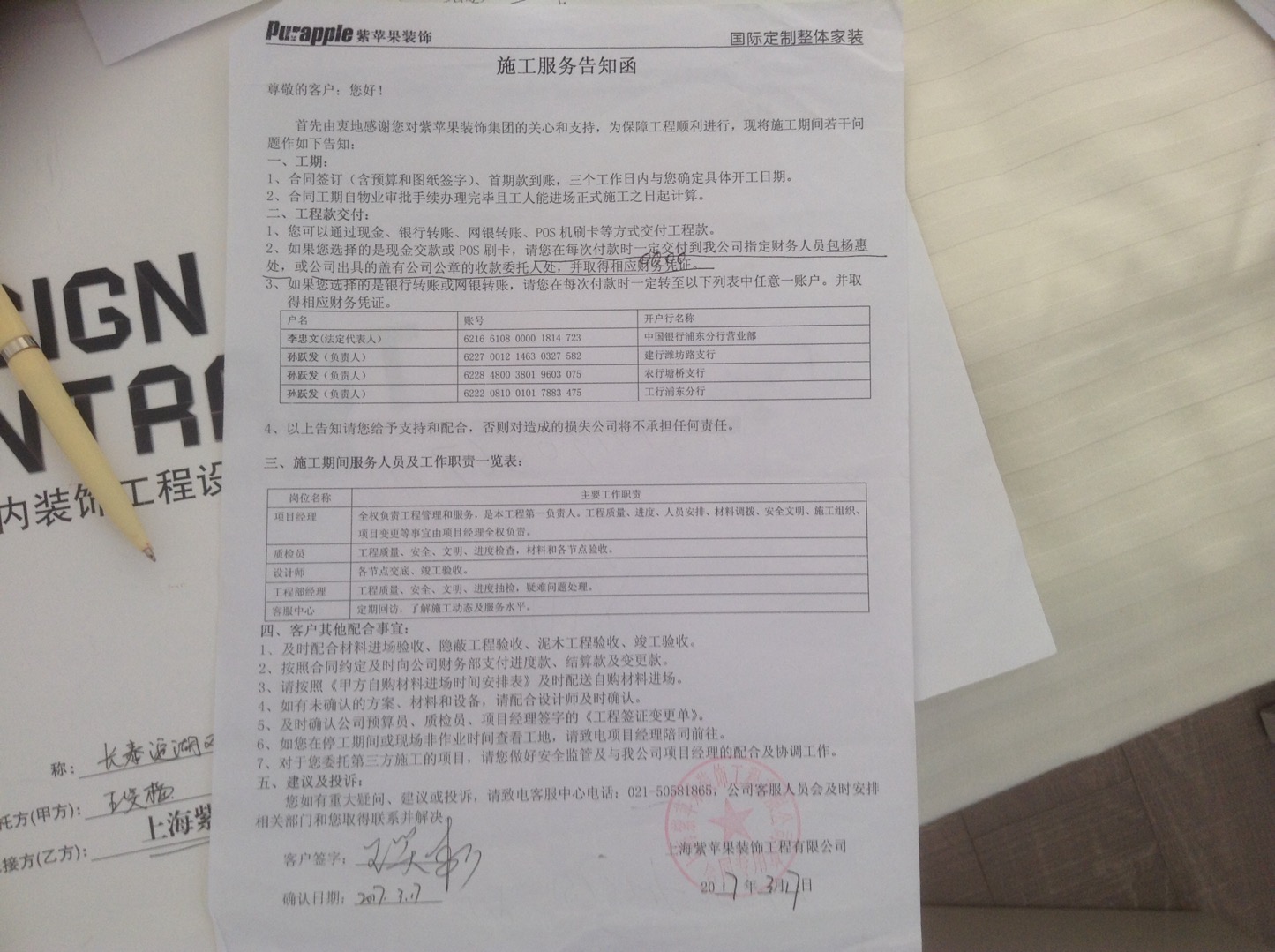 在我們家所在的小區(qū)中,現(xiàn)有十幾家裝修公司在施工。他們規(guī)范裝修、鋪設(shè)保護(hù)膜、嚴(yán)格執(zhí)行物業(yè)要求文明施工。反觀紫蘋果公司在給我們家裝修時(shí),開(kāi)工不貼保護(hù)膜,當(dāng)我們發(fā)現(xiàn)提出質(zhì)疑后,才將其補(bǔ)上。還有令人生氣的是:紫蘋果公司在我們家工地的展示牌上業(yè)主姓名并不是我們夫妻的姓名。而是另外的一家業(yè)主信息。