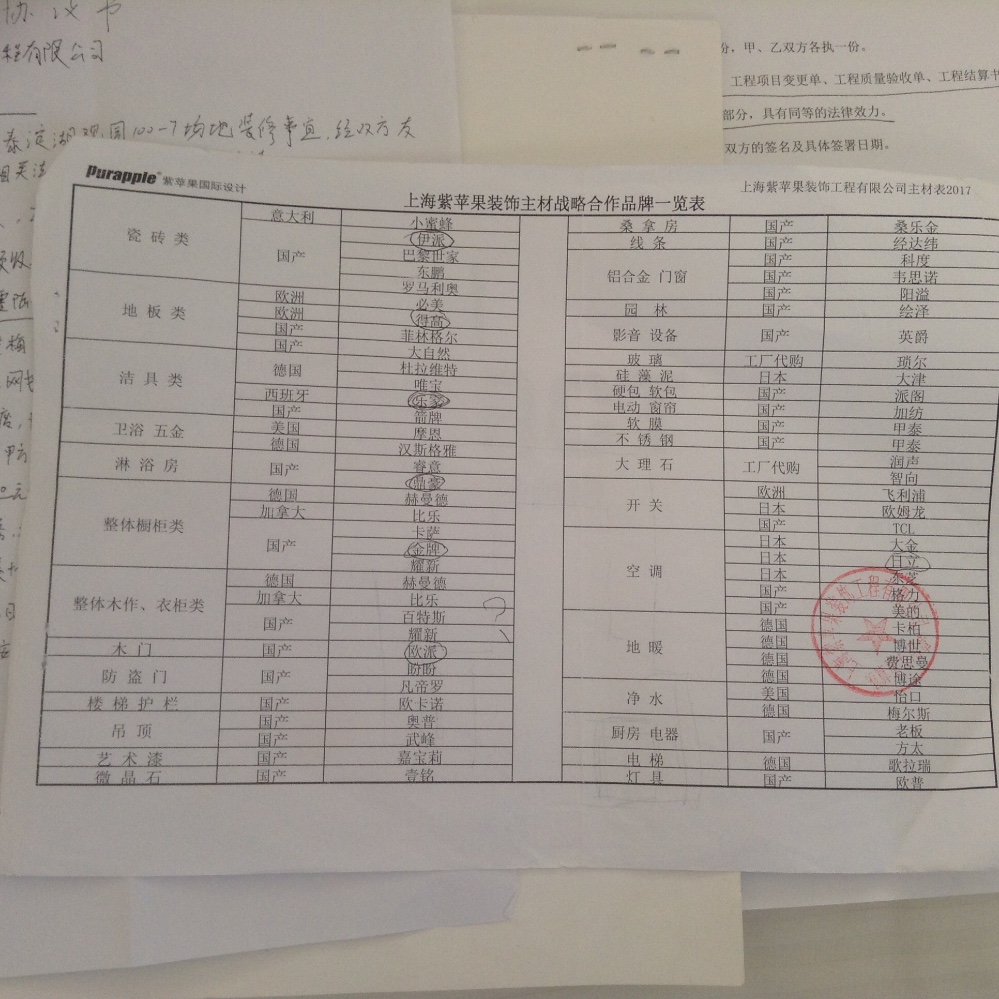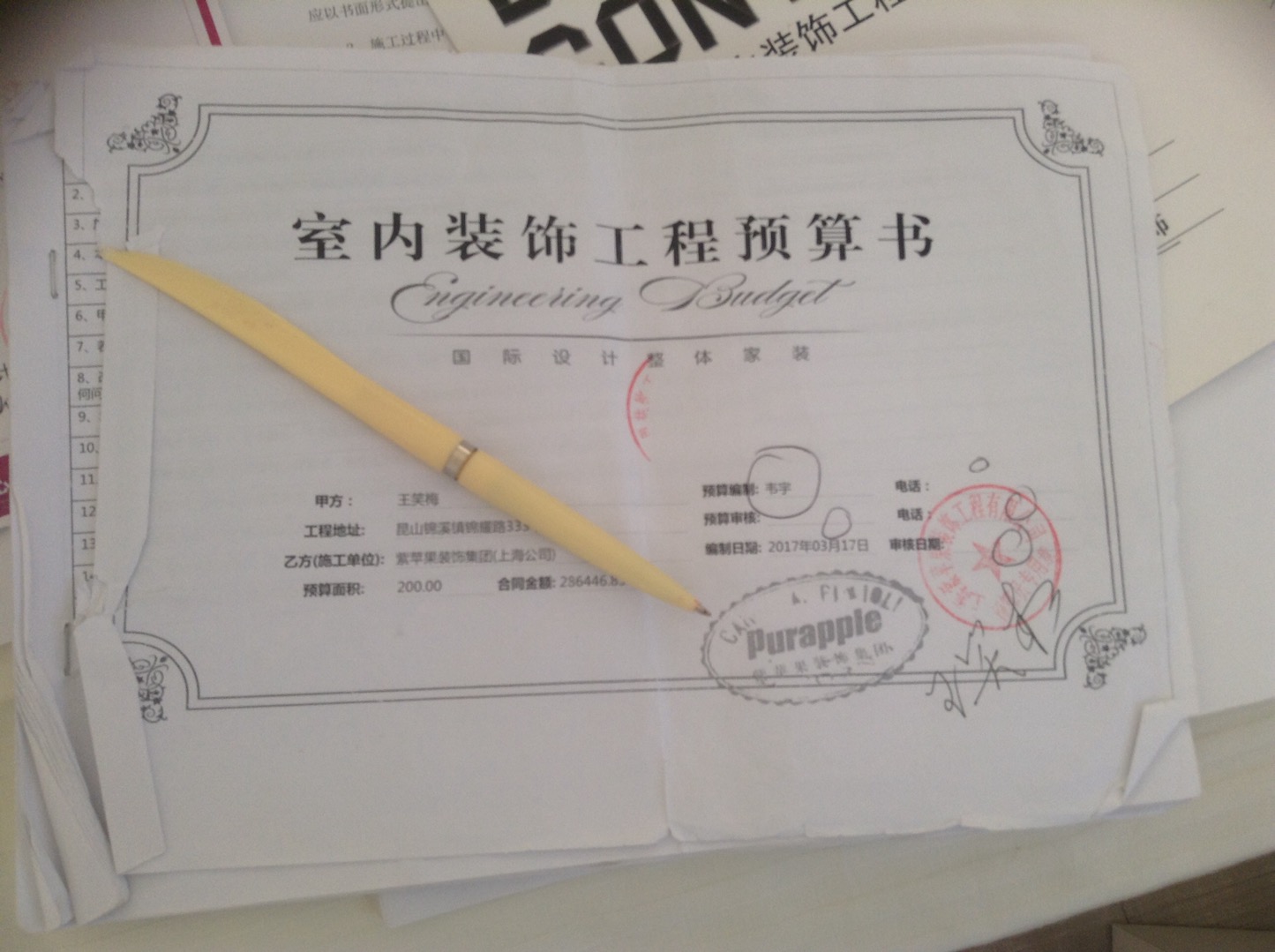 我們于2016年12月與紫蘋果裝飾工程有限公司商談裝修昆山市淀山湖的聯(lián)排別墅事宜。并于2017年2月22日、2017年3月17曰分別簽署了二萬(wàn)元的裝修設(shè)計(jì)合同及總價(jià)款480229.83元(其中基礎(chǔ)裝修款為286446.83,主材款為193783.02)的施工合同。從那時(shí)至今,紫蘋果公司為我們提供的服務(wù)出現(xiàn)了一系列的惡劣事件: