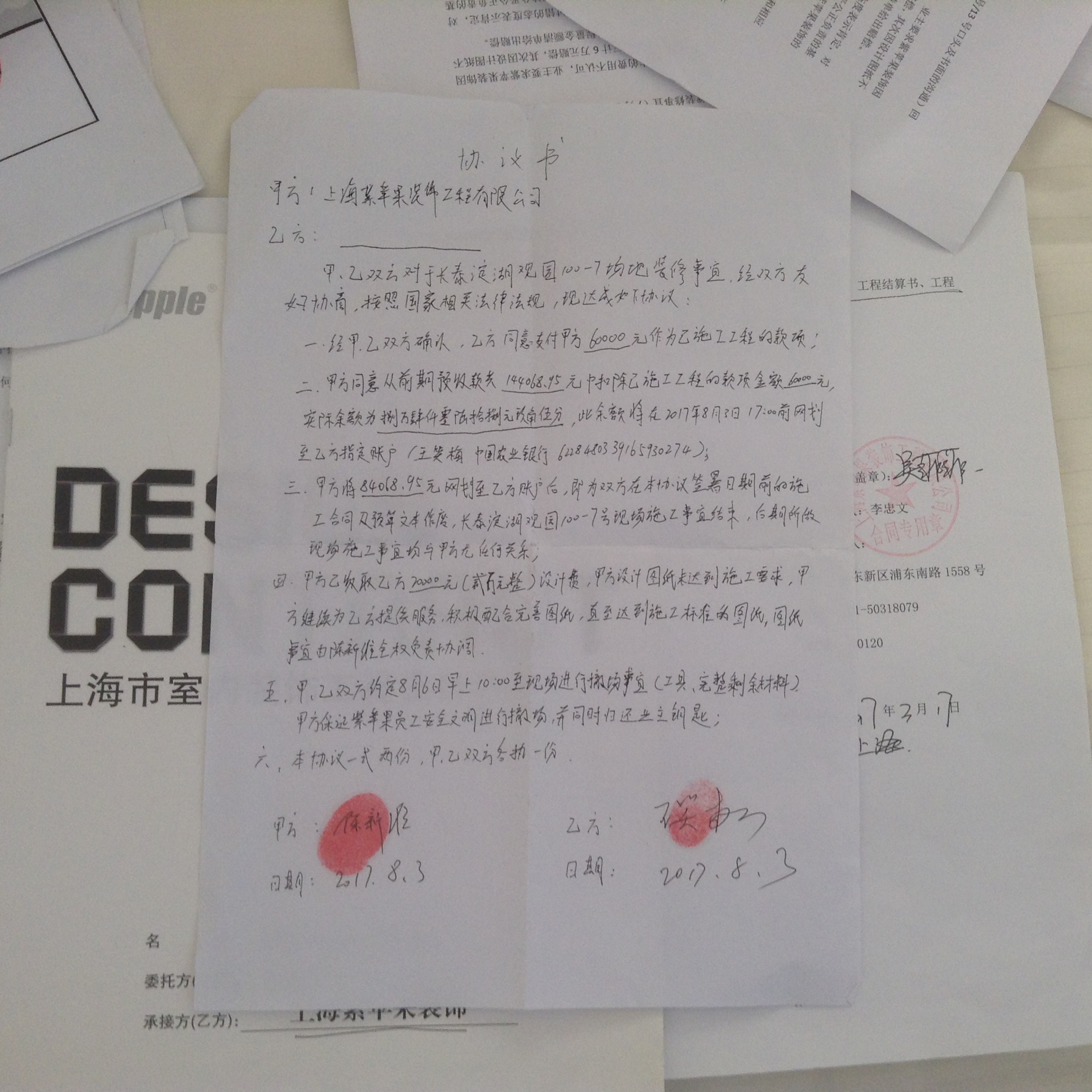 8月3號(hào),我們?cè)俅蔚阶咸O果解決問(wèn)題。從下午2點(diǎn)一直談到后半夜二點(diǎn)多。氣溫三十幾度,空調(diào)不開(kāi),我是一個(gè)六十歲的老人,因?yàn)橹熬蜕撕芏鄽?,身體就不太好,這樣一折騰,我渾身上下都是汗,人都要虛脫了,再拖下去,我感覺(jué)要暈了。他們陳副總說(shuō),今天不簽,今天談的都不算數(shù),明天從頭再來(lái),再重談。他提出要扣除水電施工費(fèi)用6萬(wàn)元。解除合同,他們撤場(chǎng)。他們將之前有問(wèn)題的設(shè)計(jì)圖完善到可以施工為止。無(wú)奈之下,我只好簽了協(xié)議。