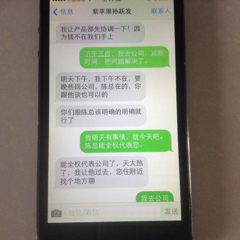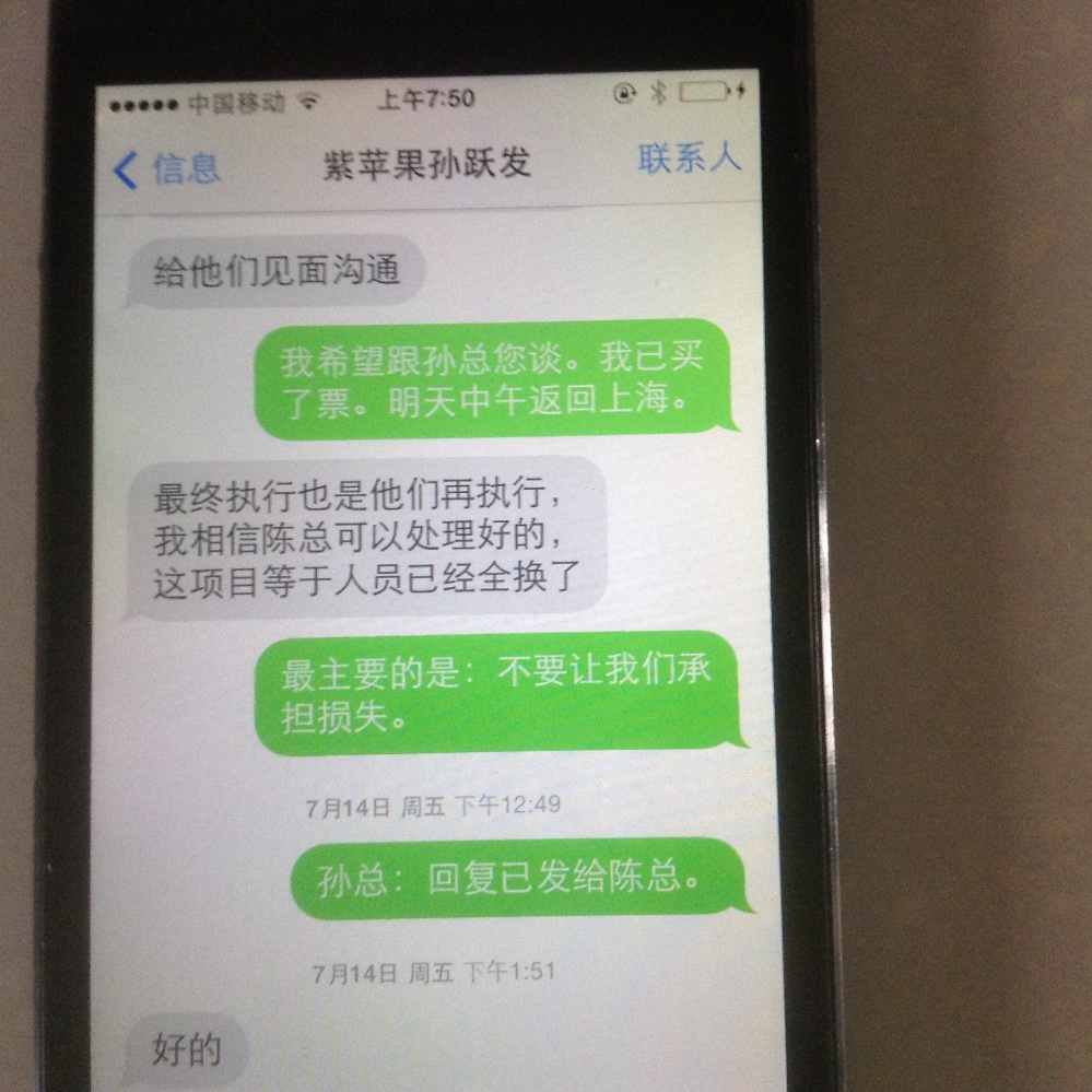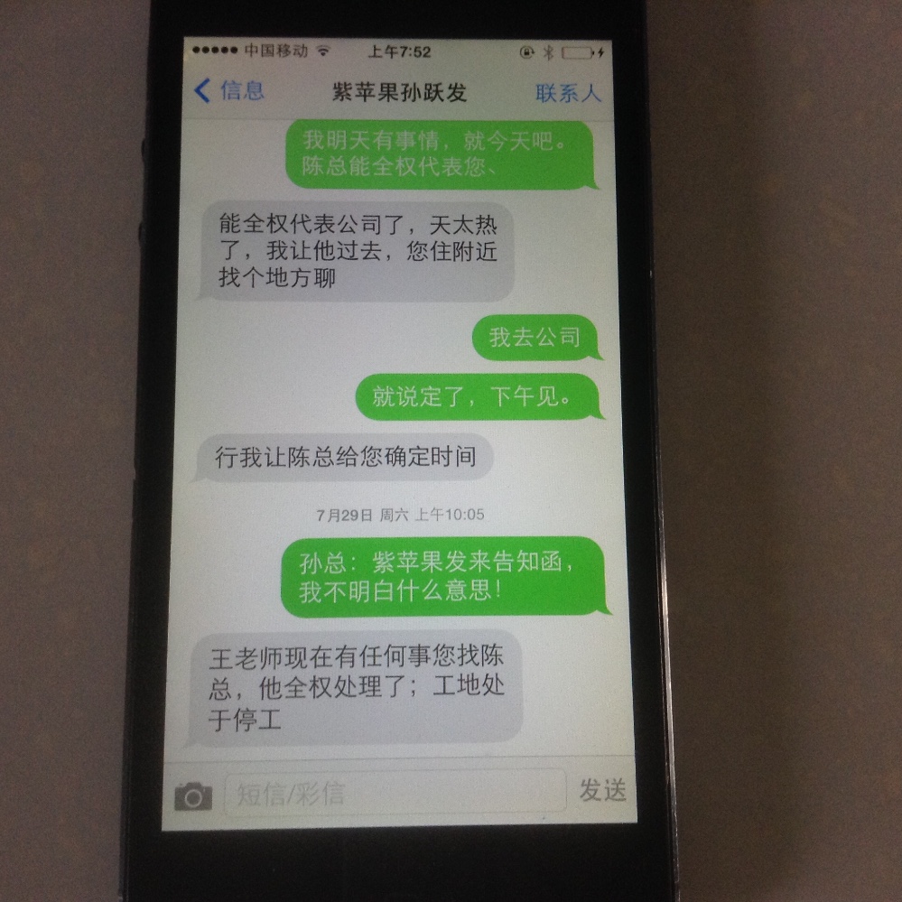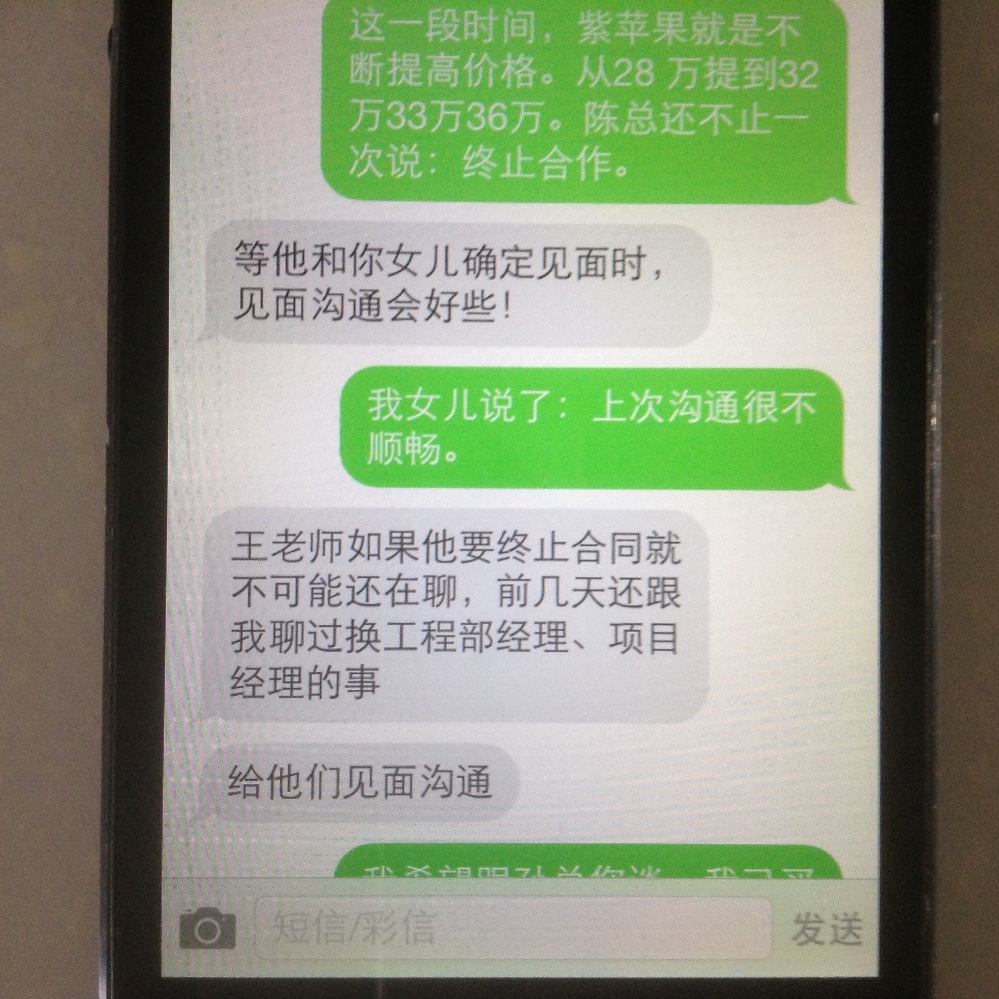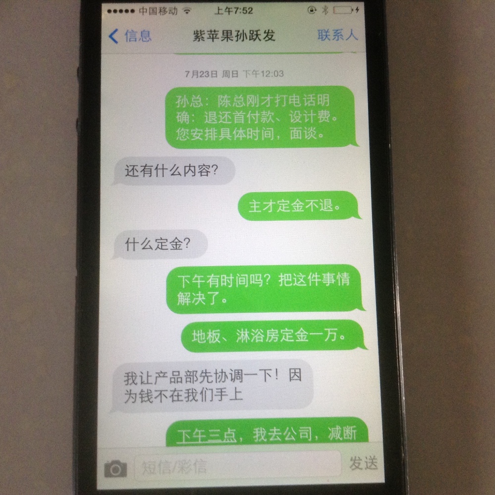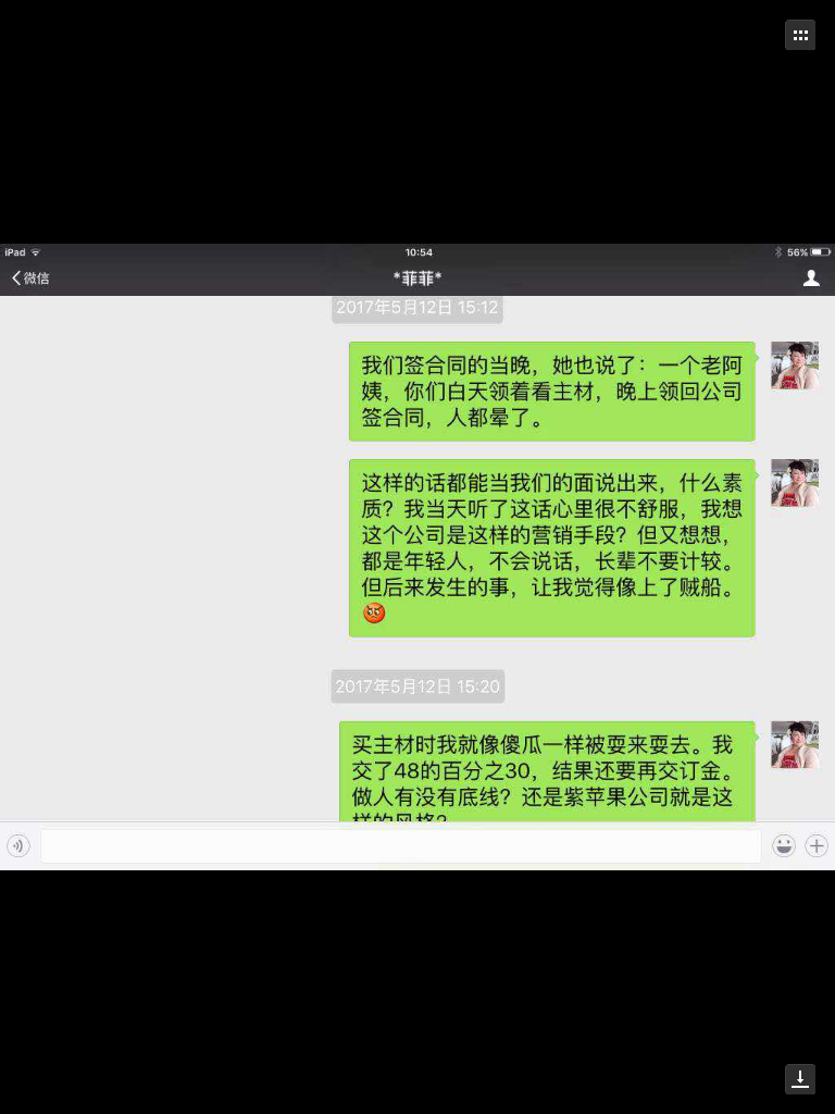停工期間,我們一直以善良之心、包容之心去考慮這件事。以為紫蘋果公司會(huì)把問(wèn)題解決了。我們多次與紫蘋果總經(jīng)理孫躍發(fā)溝通,他都說(shuō)問(wèn)題會(huì)有辦法解決的,又說(shuō)去云南總部開(kāi)會(huì),問(wèn)題始終沒(méi)解決。7月份,我與紫蘋果孫總在電話中溝通,他同意二十六萬(wàn)把工程做完。第二天紫蘋果負(fù)責(zé)工程的副總陳新維打電話說(shuō)兩個(gè)方案:一是二十六萬(wàn)做完;二是紫蘋果與我們終止合作,將我們所有的款項(xiàng)退回(首付款:144068.95元、設(shè)計(jì)費(fèi)20000元、主材定金10000元,總共174068.95元)。我給孫總打電話問(wèn):陳總說(shuō)的方案與他孫總昨天說(shuō)的不一致,出現(xiàn)了第二個(gè)方案。孫總說(shuō)由陳副總?cè)珯?quán)處理。有問(wèn)題找陳副總。(紫蘋果設(shè)計(jì)部經(jīng)理王杰電話中說(shuō),紫蘋果公司沒(méi)人愿意做我們家這個(gè)項(xiàng)目了)。陳副總還說(shuō)約我們?cè)谧咸O果公司以外的地方見(jiàn)面解決問(wèn)題。我們堅(jiān)持在公司解決。我們?nèi)齻€(gè)人(我、我女兒、我們的朋友)當(dāng)天下午趕到紫蘋果公司,在三樓孫總的辦公室,我們對(duì)陳副總說(shuō):二個(gè)方案中給我們一個(gè)明確的最終方案。他說(shuō)第二個(gè)方案,退款。我們反復(fù)問(wèn)他你的方案是退款嗎?他說(shuō)是的。后來(lái)他把退款協(xié)議打印出來(lái),我們要求雙方簽字,他說(shuō),他要出差,我們說(shuō)簽字就幾分鐘的時(shí)間,不會(huì)耽擱你的行程的。他把未簽字的協(xié)議扔在地上,轉(zhuǎn)身跑到電梯旁,我們也跟了過(guò)去,這時(shí),他吼了一聲,令人恐怖的事情發(fā)生了,紫蘋果公司有七八個(gè)人圍了上來(lái),其中負(fù)責(zé)我們家項(xiàng)目的工程部經(jīng)理任卓竟然舉著拳頭沖上來(lái)要打我們的朋友,我當(dāng)時(shí)一下沖到前邊用身體護(hù)住我們的朋友,不讓他打到。我說(shuō):不要把民事糾紛變成刑事案件,同時(shí)我女兒報(bào)了警。警方到場(chǎng),把雙方帶到派出所。在派出所里,警方對(duì)紫蘋果的人說(shuō),在上海不能胡來(lái),有事找政府,要相信政府?,F(xiàn)在我們提供這個(gè)有空調(diào)的房間,你們雙方坐下來(lái)慢慢談,把問(wèn)題解決了,談好了告訴我們,特別提醒天花上有攝像。警官出去了。這時(shí)紫蘋果公司監(jiān)察部門魏經(jīng)理說(shuō):我不了解情況,我要問(wèn)問(wèn)領(lǐng)導(dǎo)。當(dāng)著我們的面,他先撥打了孫總的電話,孫總說(shuō)什么,我們不清楚。他又撥打了陳副總的電話問(wèn):是不是給我們退十七萬(wàn)多的款?陳副總說(shuō):是的。(他應(yīng)該用了免提,對(duì)方的話我們能聽(tīng)到)。掛了電話,魏經(jīng)理說(shuō):現(xiàn)在銀行已經(jīng)關(guān)門了,辦不了轉(zhuǎn)帳。說(shuō)這話時(shí)他人都正常狀態(tài)。突然,他站起來(lái)說(shuō):你們知道什么是離婚嗎?我就是一個(gè)離了婚的50歲老男人,我凈身出戶、我什么都不怕,你們想怎么樣。還拍桌子、摔水瓶。行為很恐怖。警察進(jìn)來(lái)制止他,并再次提醒他室內(nèi)有監(jiān)控設(shè)備。我當(dāng)時(shí)氣得心慌,手抖、女兒帶我去了醫(yī)院。醫(yī)生說(shuō)心臟不好的人,情緒不要激動(dòng),要臥床休息。