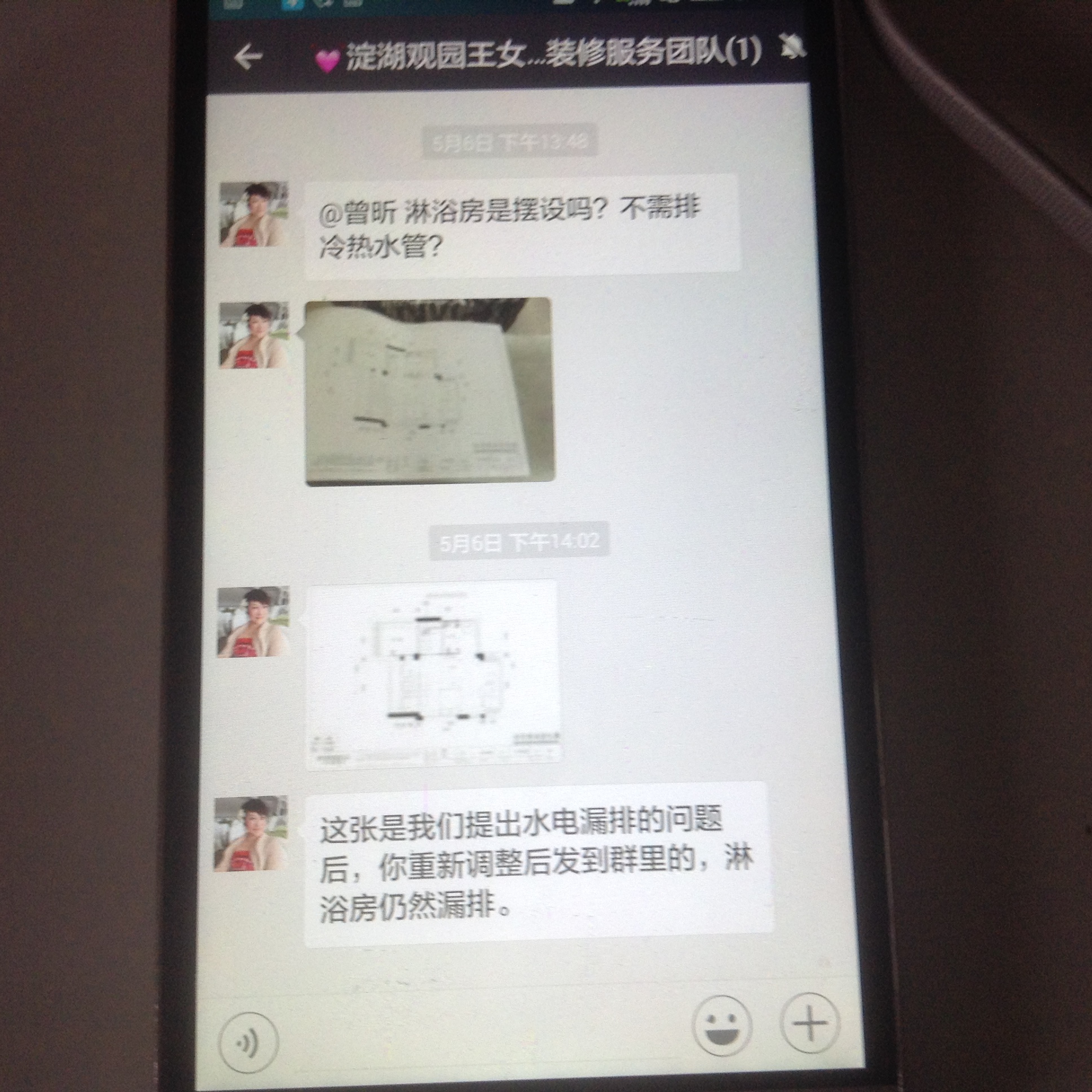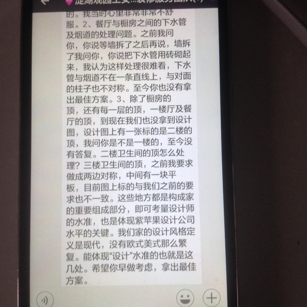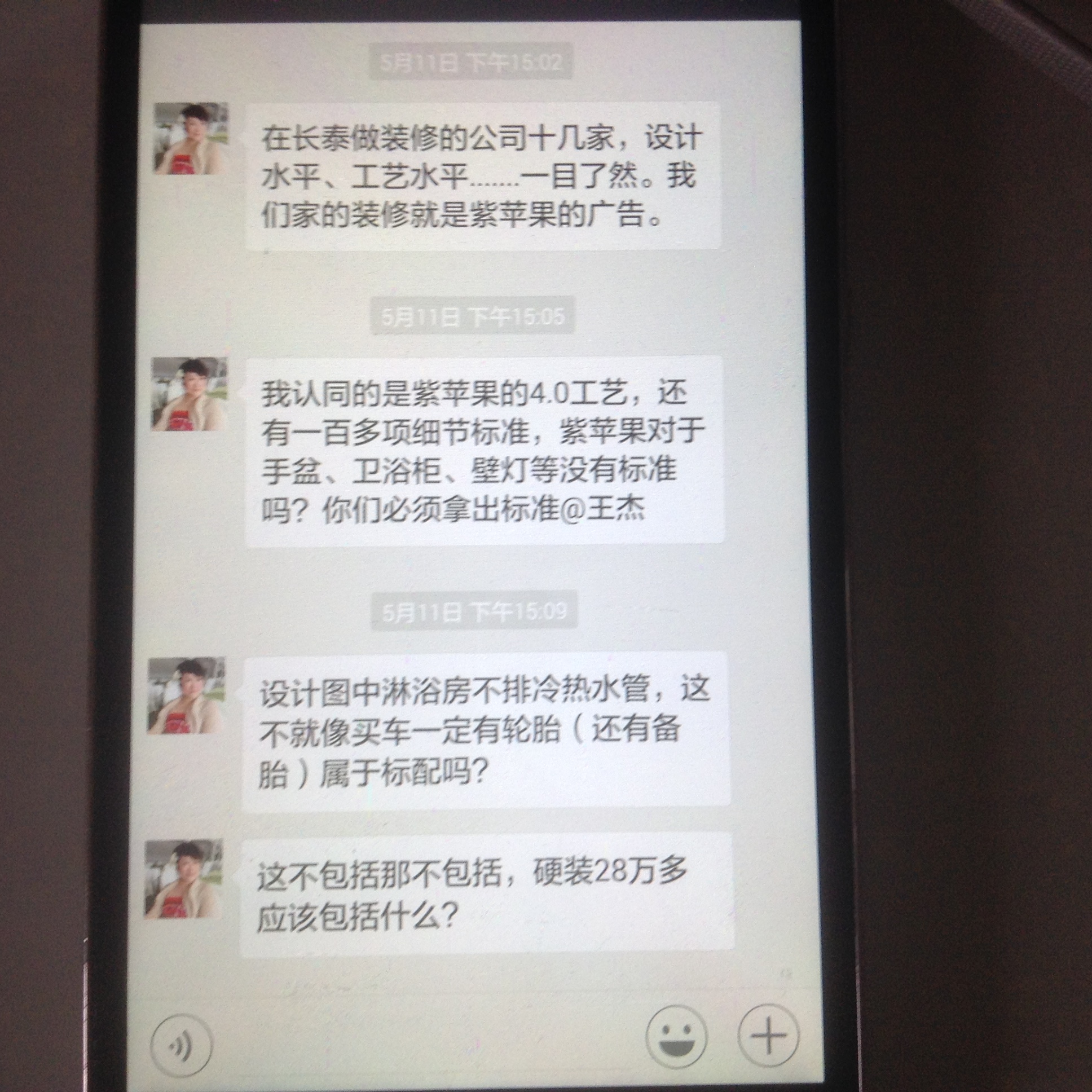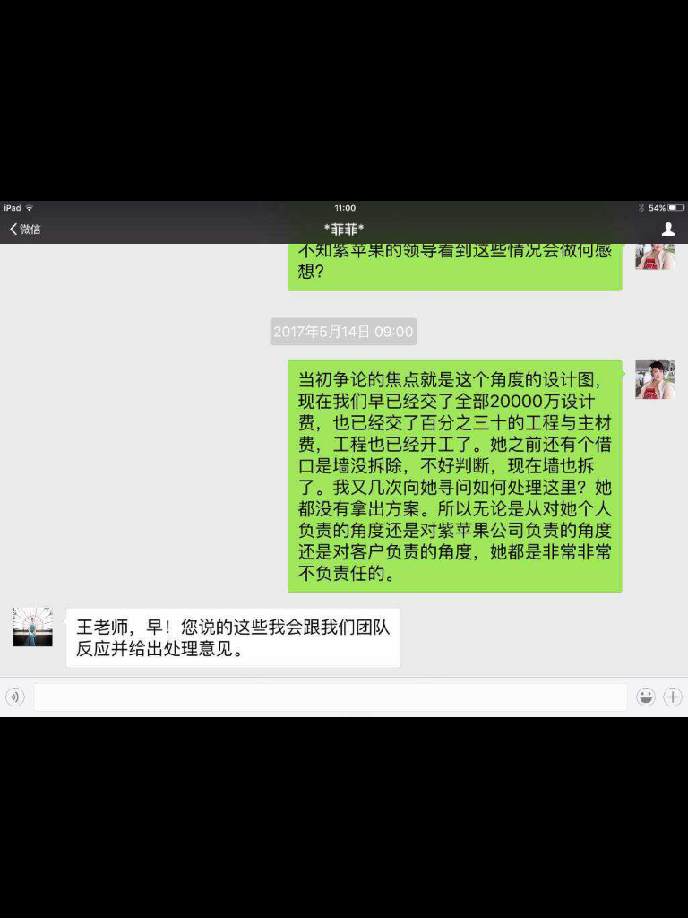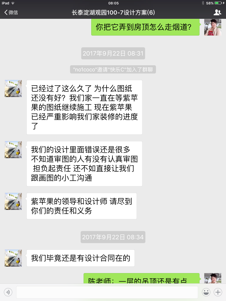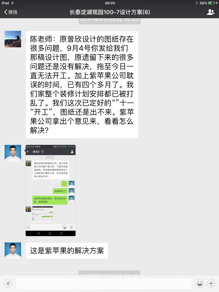 從施工一開(kāi)始,我們發(fā)現(xiàn)設(shè)計(jì)圖有問(wèn)題時(shí),就在群里表達(dá)了我們的看法,擔(dān)心有看不到的潛在風(fēng)險(xiǎn)發(fā)生。隨著工程的推進(jìn),我們不斷發(fā)現(xiàn)這樣或那樣的問(wèn)題,更加重了我們的擔(dān)憂。我們?cè)B續(xù)六天在與客戶經(jīng)理、設(shè)計(jì)部經(jīng)理的群里反映問(wèn)題、表達(dá)我們的述求,但沒(méi)人出來(lái)解決問(wèn)題,他們采取了不理不睬的態(tài)度,施工照常進(jìn)行。再后來(lái)我們將問(wèn)題直接反映給公司高層后。讓我們感到不可思議的的是紫蘋果公司高層解決問(wèn)題的方法卻是增加項(xiàng)目?jī)r(jià)款。由原來(lái)的28萬(wàn)多提到36萬(wàn)多。實(shí)際就是將紫蘋果自身過(guò)錯(cuò)造成的損失變相轉(zhuǎn)嫁到我們身上。3月17號(hào)簽合同,工期180天。正常情況下,9月16號(hào)應(yīng)該完工??勺咸O果從5月18號(hào)就將水電做到一半的工地停工,換了陳姓設(shè)計(jì)師,說(shuō)完善圖紙??蓤D紙我們一直沒(méi)拿到,問(wèn)題到現(xiàn)在還未解決。