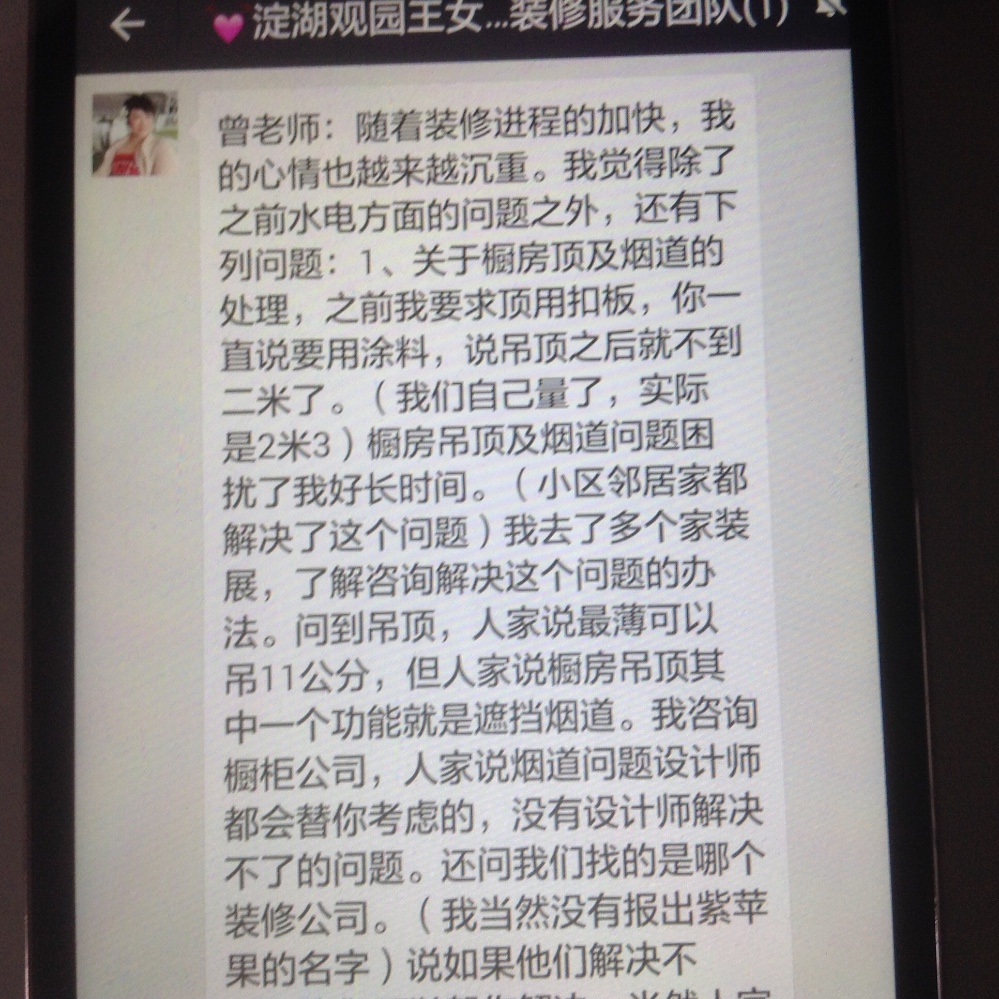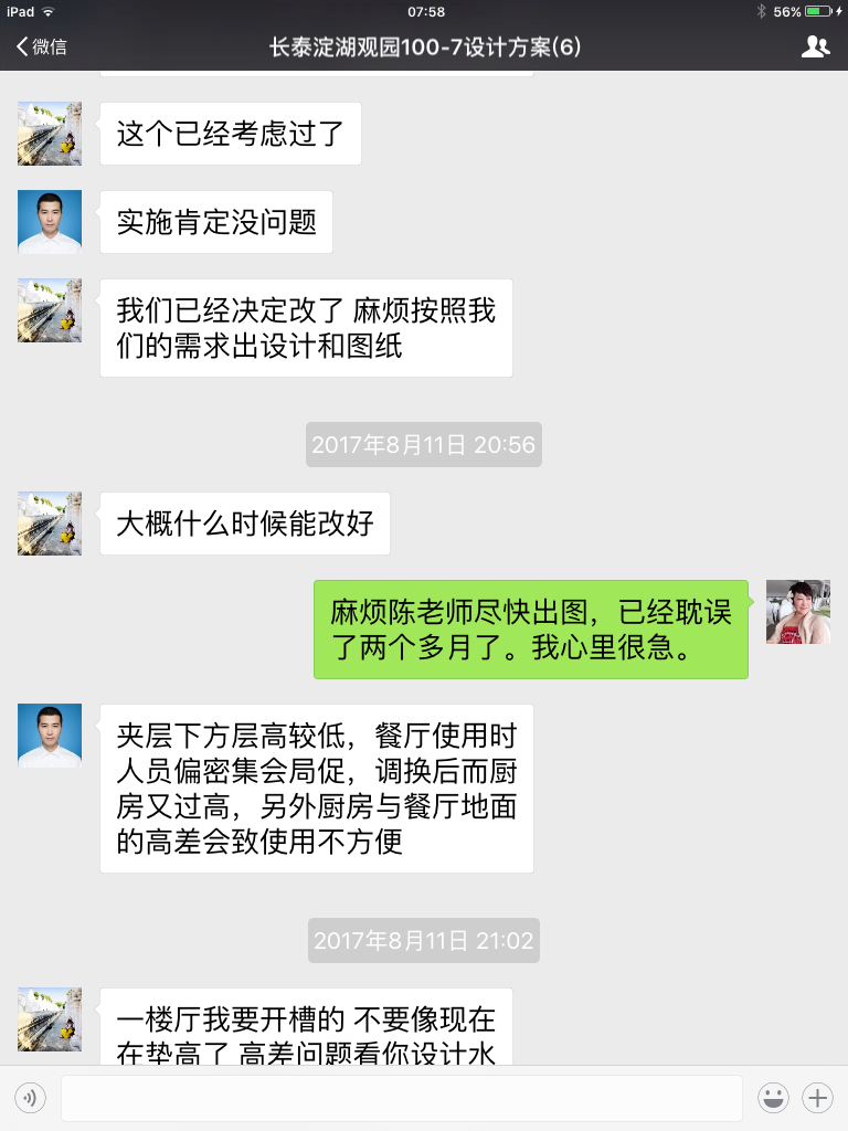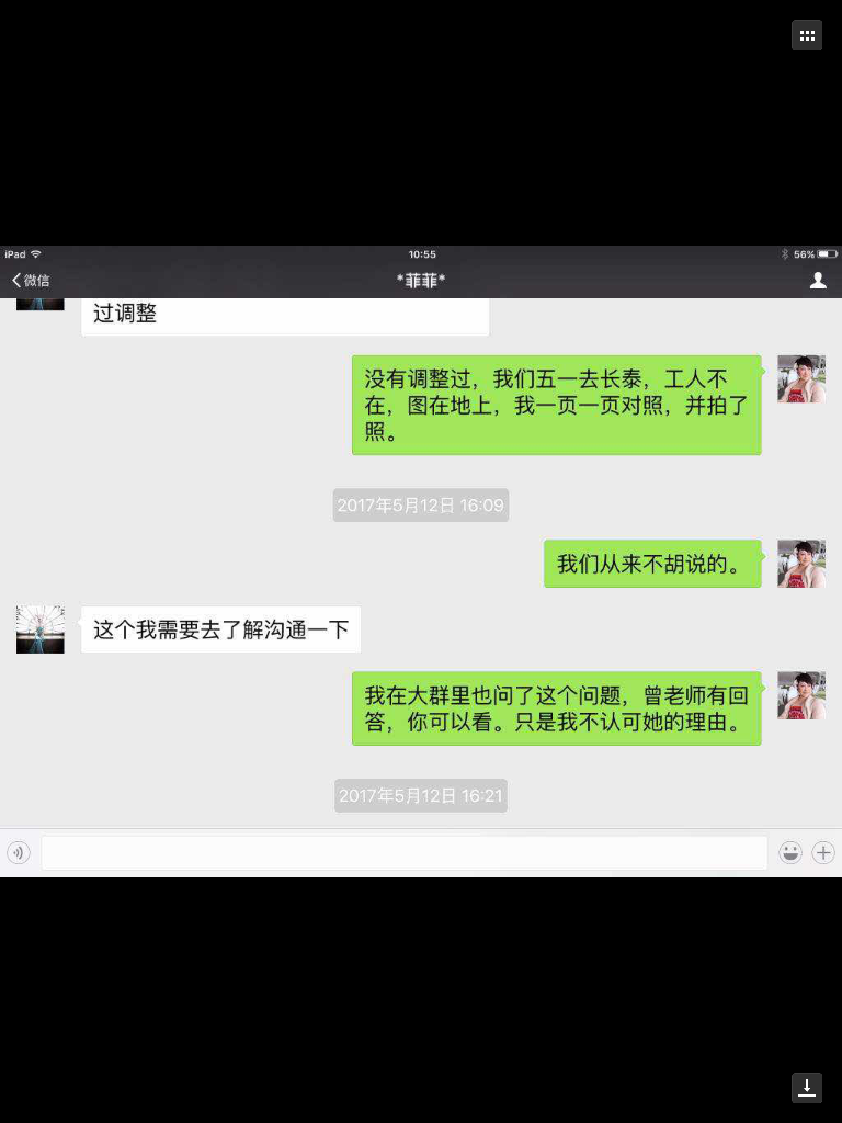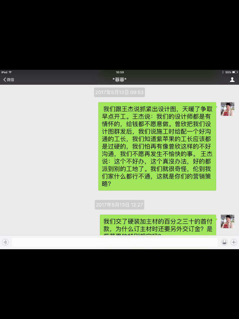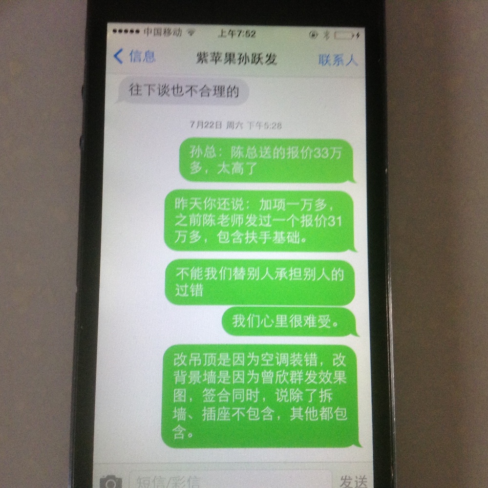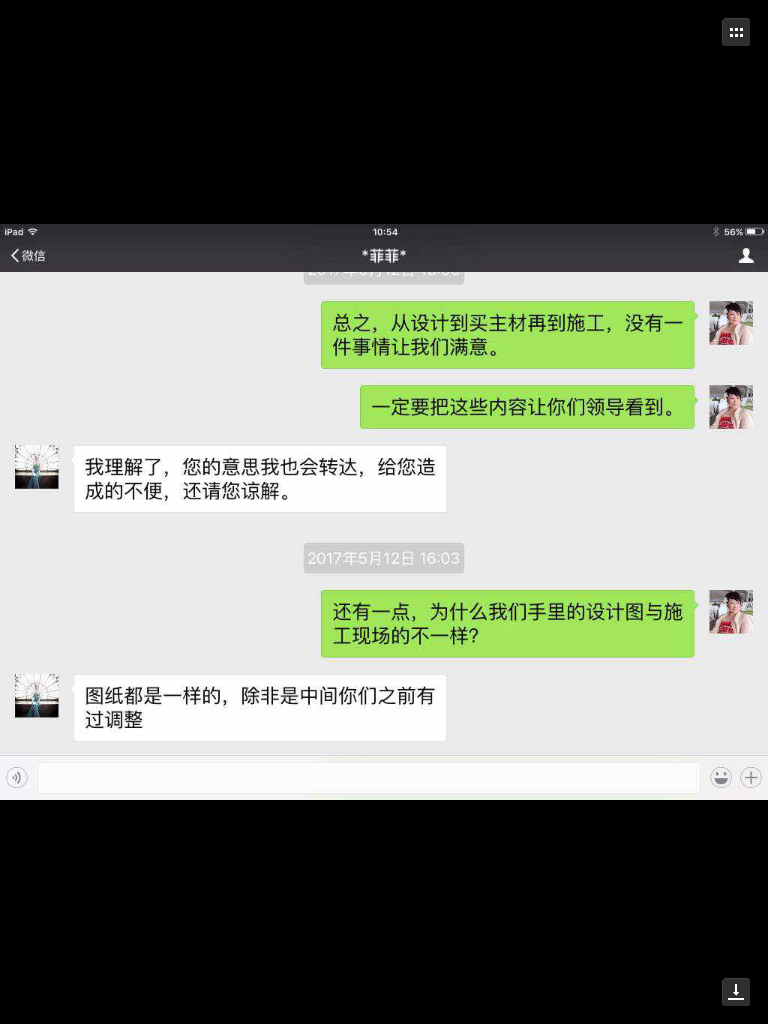 從施工一開(kāi)始,我們發(fā)現(xiàn)設(shè)計(jì)圖有問(wèn)題時(shí),就在群里表達(dá)了我們的看法,擔(dān)心有看不到的潛在風(fēng)險(xiǎn)發(fā)生。隨著工程的推進(jìn),我們不斷發(fā)現(xiàn)這樣或那樣的問(wèn)題,更加重了我們的擔(dān)憂。我們?cè)B續(xù)六天在與客戶經(jīng)理、設(shè)計(jì)部經(jīng)理的群里反映問(wèn)題、表達(dá)我們的述求,但沒(méi)人出來(lái)解決問(wèn)題,他們采取了不理不睬的態(tài)度,施工照常進(jìn)行。再后來(lái)我們將問(wèn)題直接反映給公司高層后。讓我們感到不可思議的的是紫蘋果公司高層解決問(wèn)題的方法卻是增加項(xiàng)目?jī)r(jià)款。由原來(lái)的28萬(wàn)多提到36萬(wàn)多。實(shí)際就是將紫蘋果自身過(guò)錯(cuò)造成的損失變相轉(zhuǎn)嫁到我們身上。3月17號(hào)簽合同,工期180天。正常情況下,9月16號(hào)應(yīng)該完工??勺咸O果從5月18號(hào)就將水電做到一半的工地停工,換了陳姓設(shè)計(jì)師,說(shuō)完善圖紙??蓤D紙我們一直沒(méi)拿到,問(wèn)題到現(xiàn)在還未解決。