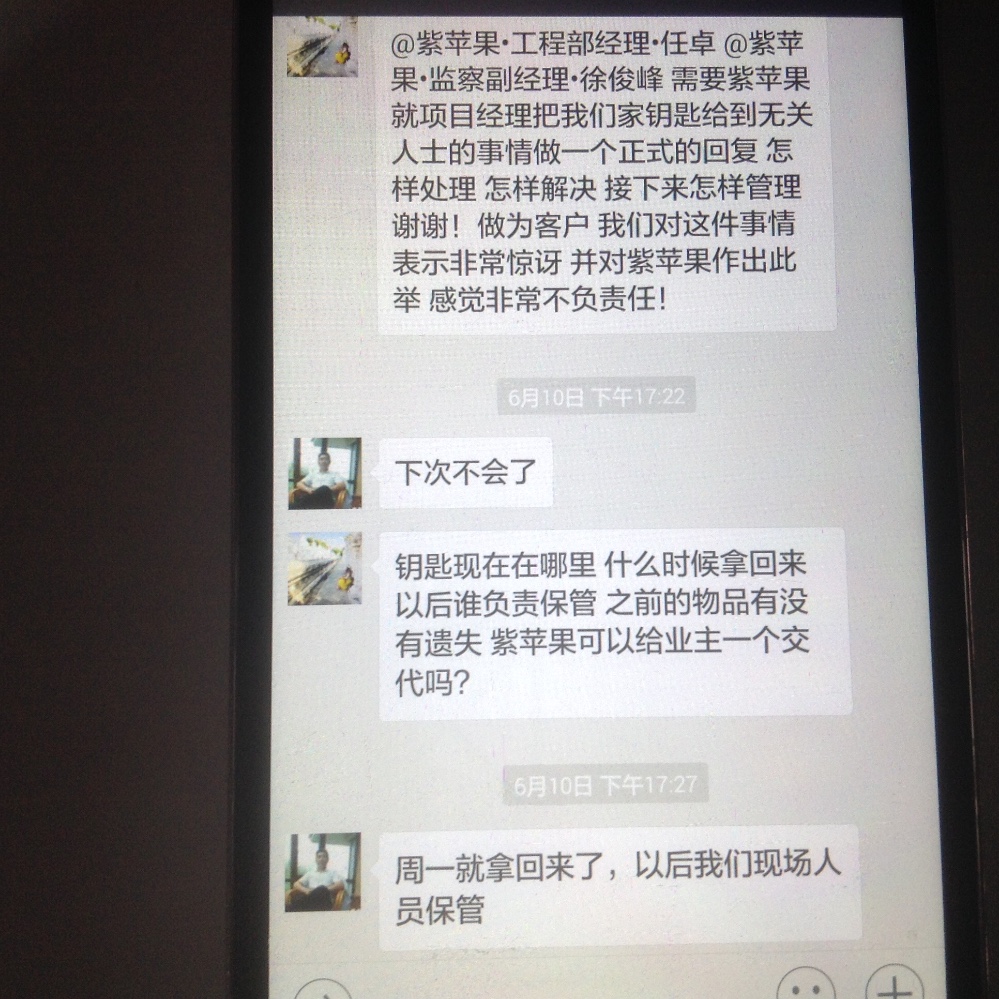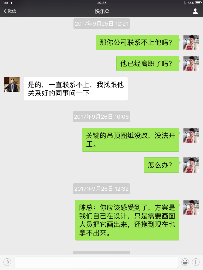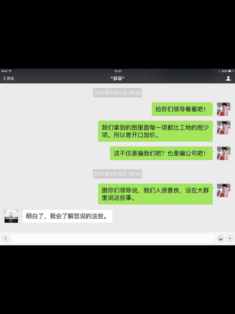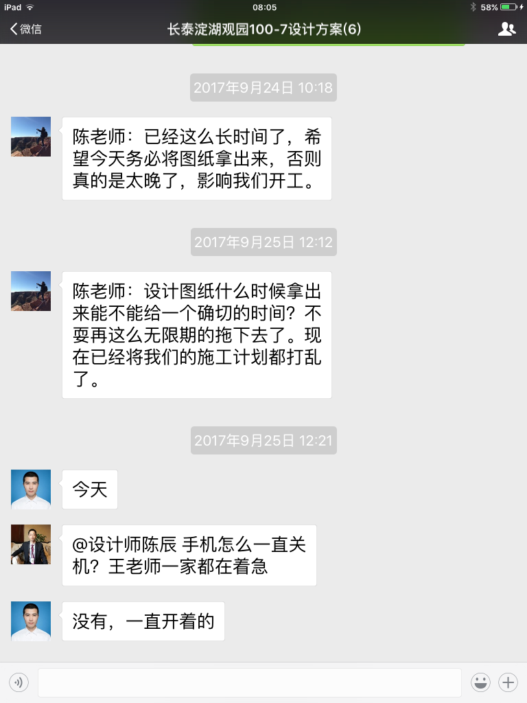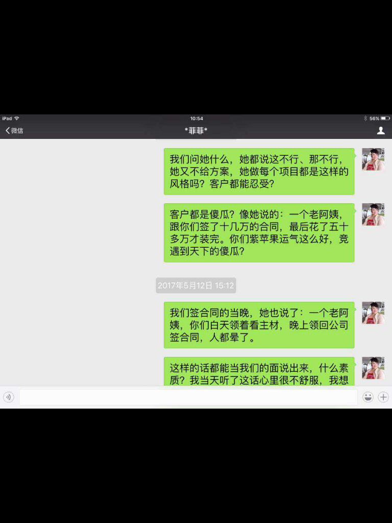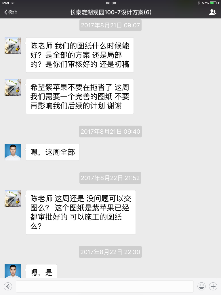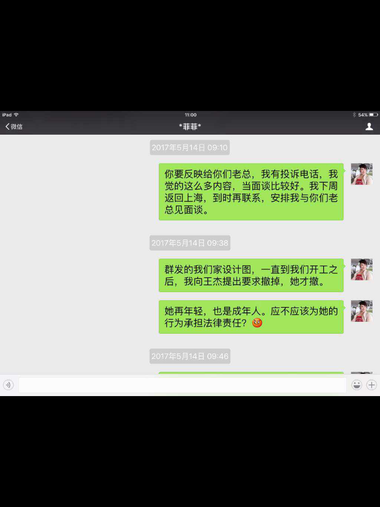 從施工一開(kāi)始,我們發(fā)現(xiàn)設(shè)計(jì)圖有問(wèn)題時(shí),就在群里表達(dá)了我們的看法,擔(dān)心有看不到的潛在風(fēng)險(xiǎn)發(fā)生。隨著工程的推進(jìn),我們不斷發(fā)現(xiàn)這樣或那樣的問(wèn)題,更加重了我們的擔(dān)憂。我們?cè)B續(xù)六天在與客戶經(jīng)理、設(shè)計(jì)部經(jīng)理的群里反映問(wèn)題、表達(dá)我們的述求,但沒(méi)人出來(lái)解決問(wèn)題,他們采取了不理不睬的態(tài)度,施工照常進(jìn)行。再后來(lái)我們將問(wèn)題直接反映給公司高層后。讓我們感到不可思議的的是紫蘋果公司高層解決問(wèn)題的方法卻是增加項(xiàng)目?jī)r(jià)款。由原來(lái)的28萬(wàn)多提到36萬(wàn)多。實(shí)際就是將紫蘋果自身過(guò)錯(cuò)造成的損失變相轉(zhuǎn)嫁到我們身上。3月17號(hào)簽合同,工期180天。正常情況下,9月16號(hào)應(yīng)該完工??勺咸O果從5月18號(hào)就將水電做到一半的工地停工,換了陳姓設(shè)計(jì)師,說(shuō)完善圖紙??蓤D紙我們一直沒(méi)拿到,問(wèn)題到現(xiàn)在還未解決。
