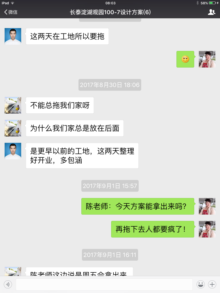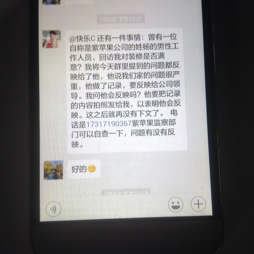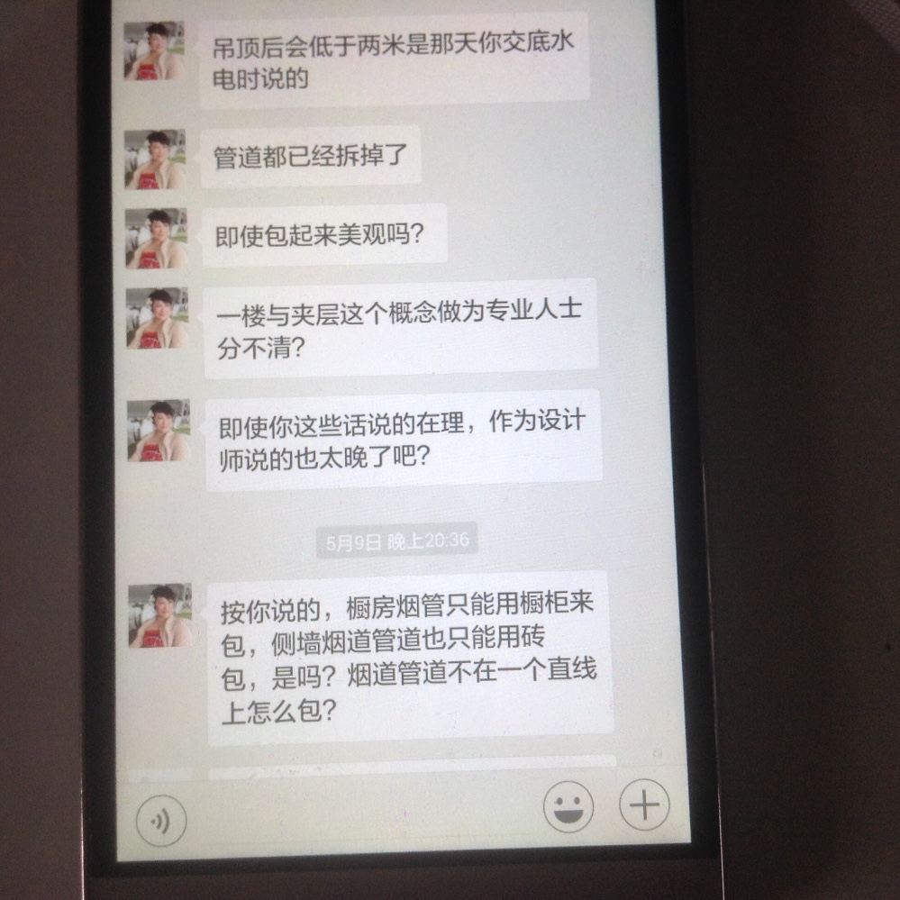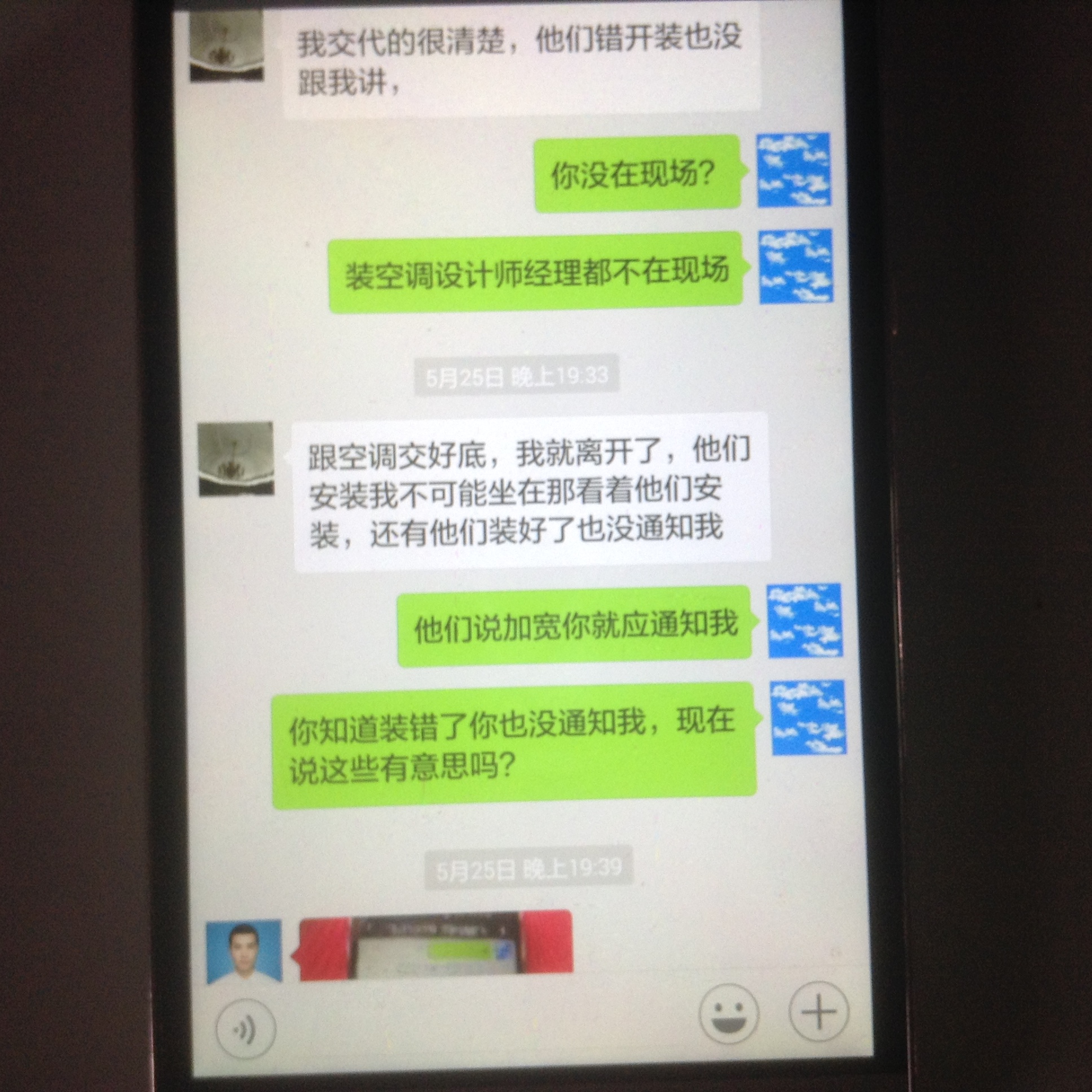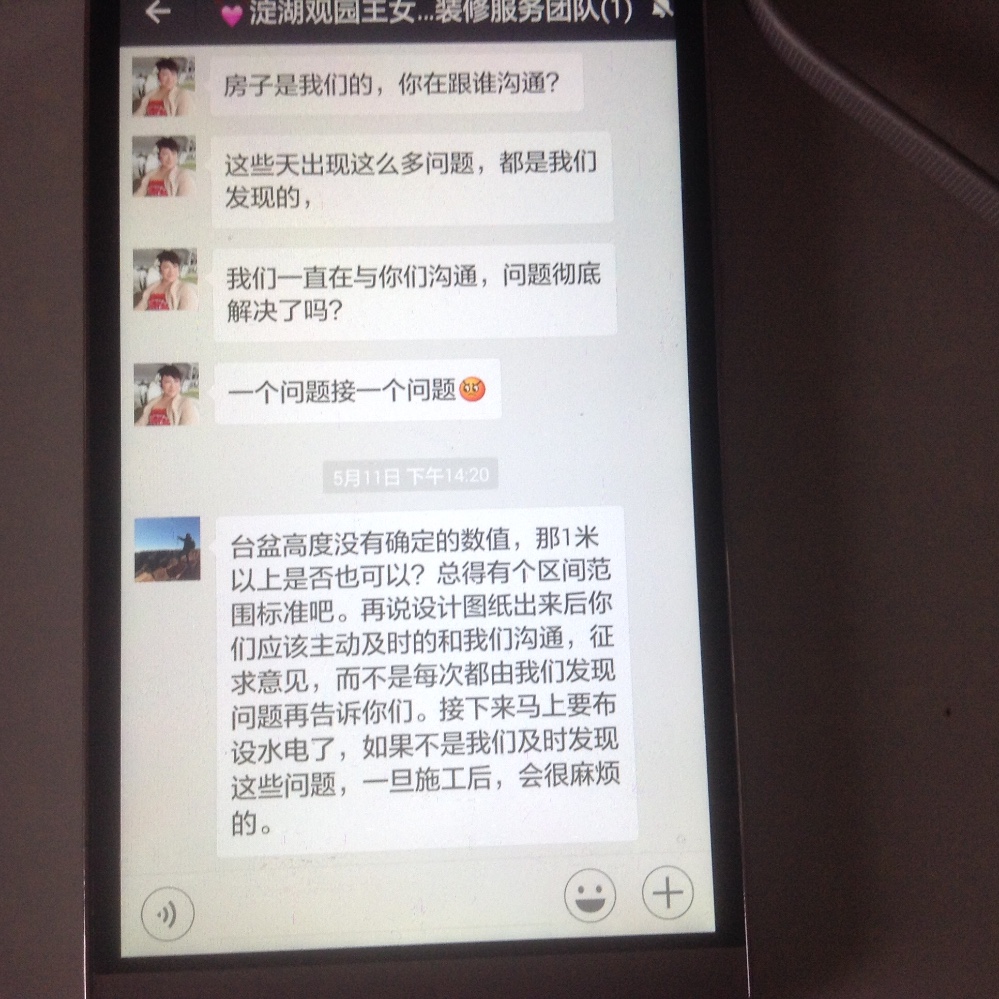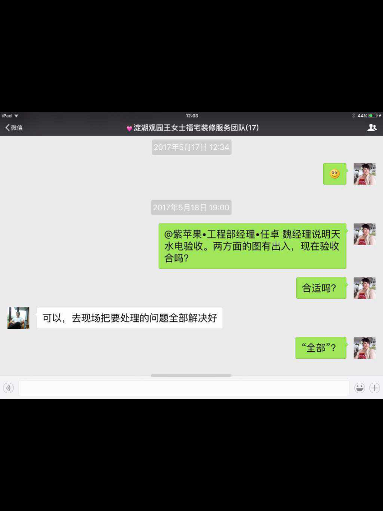 從施工一開(kāi)始,我們發(fā)現(xiàn)設(shè)計(jì)圖有問(wèn)題時(shí),就在群里表達(dá)了我們的看法,擔(dān)心有看不到的潛在風(fēng)險(xiǎn)發(fā)生。隨著工程的推進(jìn),我們不斷發(fā)現(xiàn)這樣或那樣的問(wèn)題,更加重了我們的擔(dān)憂。我們?cè)B續(xù)六天在與客戶經(jīng)理、設(shè)計(jì)部經(jīng)理的群里反映問(wèn)題、表達(dá)我們的述求,但沒(méi)人出來(lái)解決問(wèn)題,他們采取了不理不睬的態(tài)度,施工照常進(jìn)行。再后來(lái)我們將問(wèn)題直接反映給公司高層后。讓我們感到不可思議的的是紫蘋果公司高層解決問(wèn)題的方法卻是增加項(xiàng)目?jī)r(jià)款。由原來(lái)的28萬(wàn)多提到36萬(wàn)多。實(shí)際就是將紫蘋果自身過(guò)錯(cuò)造成的損失變相轉(zhuǎn)嫁到我們身上。3月17號(hào)簽合同,工期180天。正常情況下,9月16號(hào)應(yīng)該完工??勺咸O果從5月18號(hào)就將水電做到一半的工地停工,換了陳姓設(shè)計(jì)師,說(shuō)完善圖紙??蓤D紙我們一直沒(méi)拿到,問(wèn)題到現(xiàn)在還未解決。