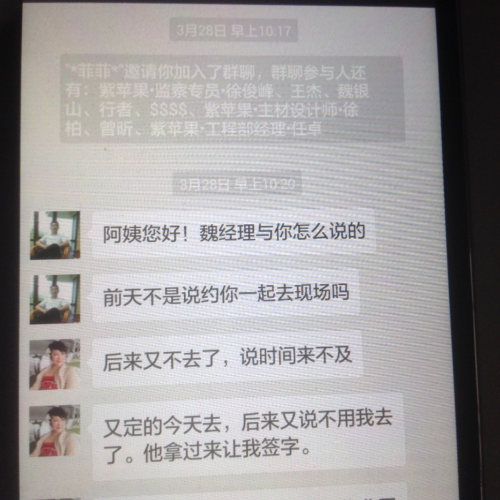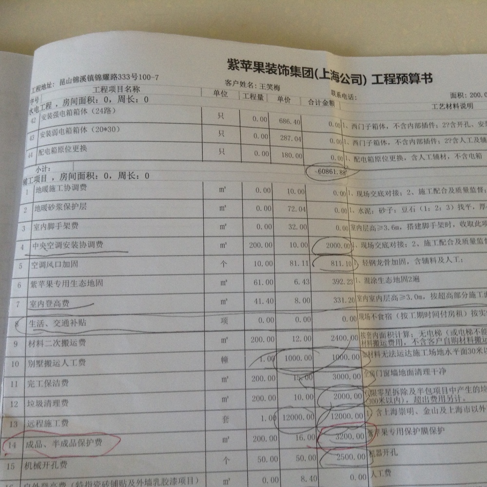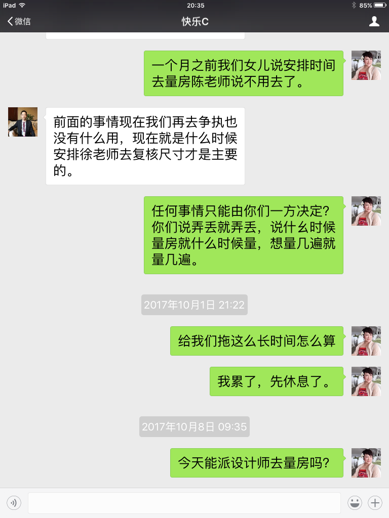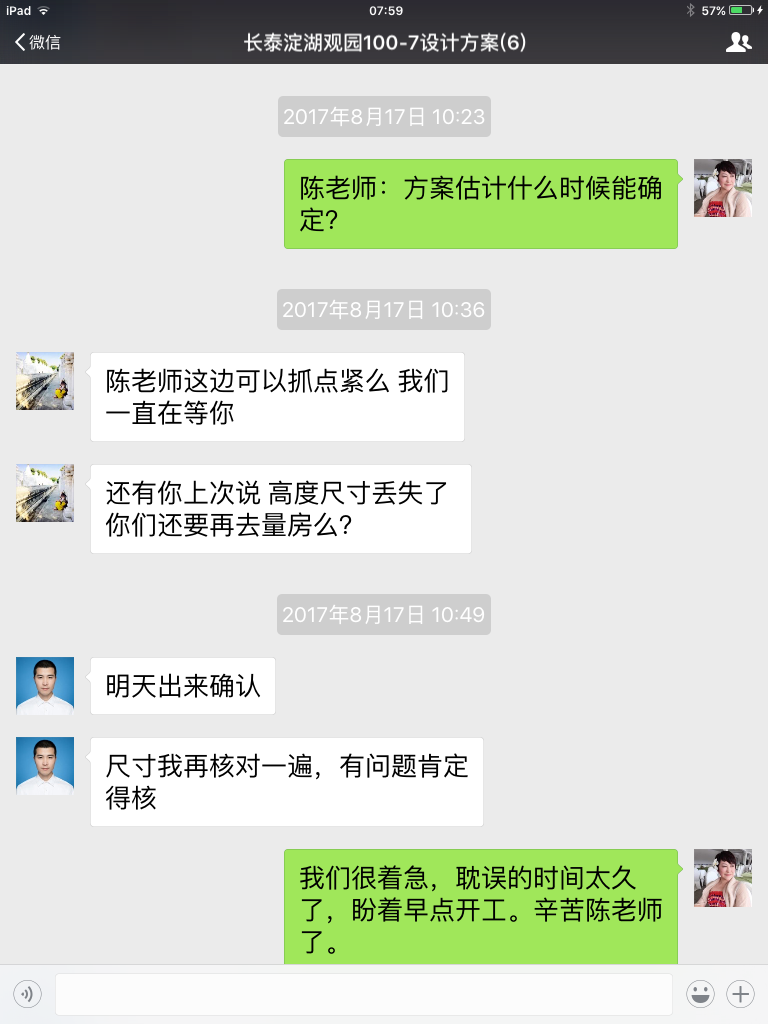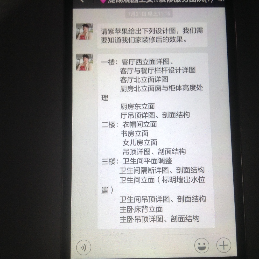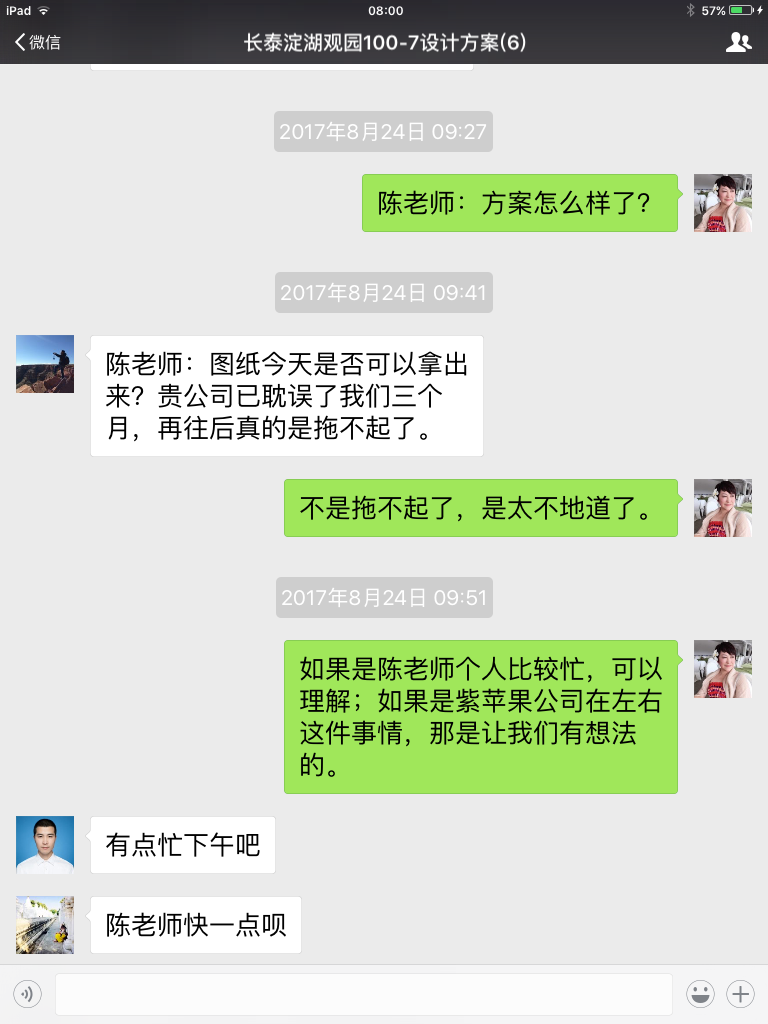 從施工一開(kāi)始,我們發(fā)現(xiàn)設(shè)計(jì)圖有問(wèn)題時(shí),就在群里表達(dá)了我們的看法,擔(dān)心有看不到的潛在風(fēng)險(xiǎn)發(fā)生。隨著工程的推進(jìn),我們不斷發(fā)現(xiàn)這樣或那樣的問(wèn)題,更加重了我們的擔(dān)憂。我們?cè)B續(xù)六天在與客戶經(jīng)理、設(shè)計(jì)部經(jīng)理的群里反映問(wèn)題、表達(dá)我們的述求,但沒(méi)人出來(lái)解決問(wèn)題,他們采取了不理不睬的態(tài)度,施工照常進(jìn)行。再后來(lái)我們將問(wèn)題直接反映給公司高層后。讓我們感到不可思議的的是紫蘋果公司高層解決問(wèn)題的方法卻是增加項(xiàng)目?jī)r(jià)款。由原來(lái)的28萬(wàn)多提到36萬(wàn)多。實(shí)際就是將紫蘋果自身過(guò)錯(cuò)造成的損失變相轉(zhuǎn)嫁到我們身上。3月17號(hào)簽合同,工期180天。正常情況下,9月16號(hào)應(yīng)該完工??勺咸O果從5月18號(hào)就將水電做到一半的工地停工,換了陳姓設(shè)計(jì)師,說(shuō)完善圖紙??蓤D紙我們一直沒(méi)拿到,問(wèn)題到現(xiàn)在還未解決。