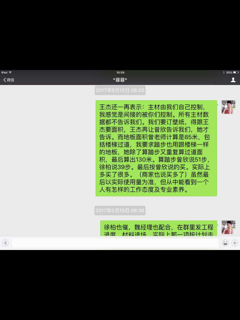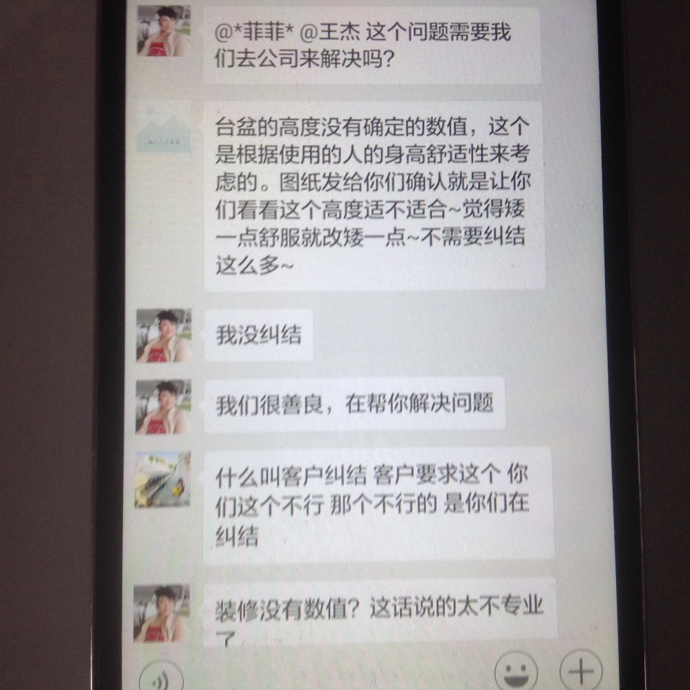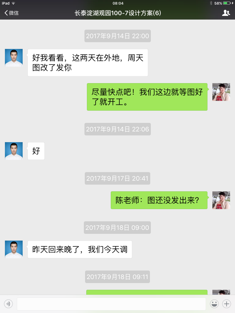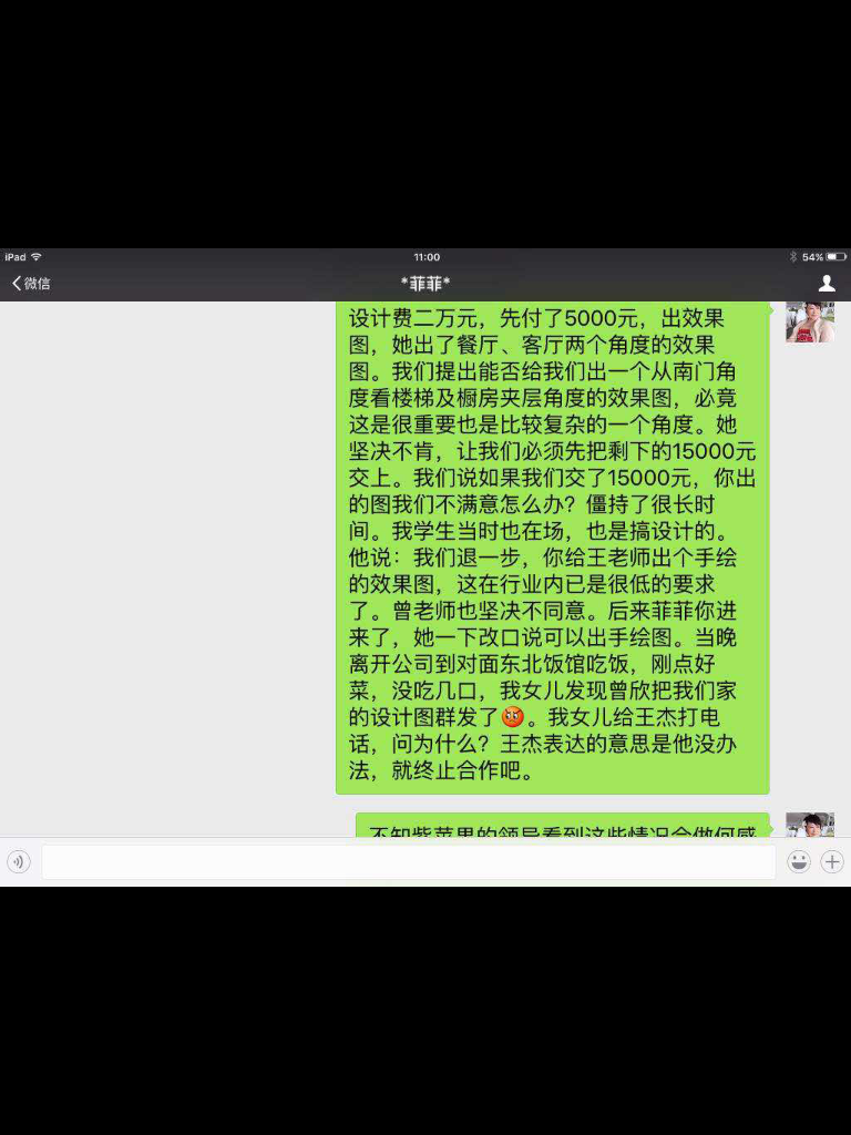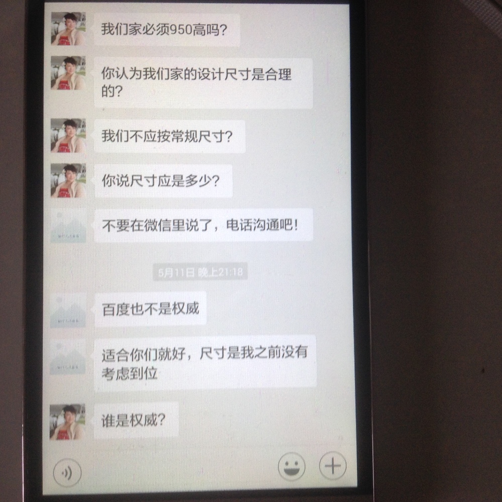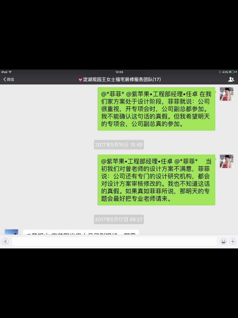 從施工一開(kāi)始,我們發(fā)現(xiàn)設(shè)計(jì)圖有問(wèn)題時(shí),就在群里表達(dá)了我們的看法,擔(dān)心有看不到的潛在風(fēng)險(xiǎn)發(fā)生。隨著工程的推進(jìn),我們不斷發(fā)現(xiàn)這樣或那樣的問(wèn)題,更加重了我們的擔(dān)憂。我們?cè)B續(xù)六天在與客戶經(jīng)理、設(shè)計(jì)部經(jīng)理的群里反映問(wèn)題、表達(dá)我們的述求,但沒(méi)人出來(lái)解決問(wèn)題,他們采取了不理不睬的態(tài)度,施工照常進(jìn)行。再后來(lái)我們將問(wèn)題直接反映給公司高層后。讓我們感到不可思議的的是紫蘋果公司高層解決問(wèn)題的方法卻是增加項(xiàng)目?jī)r(jià)款。由原來(lái)的28萬(wàn)多提到36萬(wàn)多。實(shí)際就是將紫蘋果自身過(guò)錯(cuò)造成的損失變相轉(zhuǎn)嫁到我們身上。3月17號(hào)簽合同,工期180天。正常情況下,9月16號(hào)應(yīng)該完工??勺咸O果從5月18號(hào)就將水電做到一半的工地停工,換了陳姓設(shè)計(jì)師,說(shuō)完善圖紙??蓤D紙我們一直沒(méi)拿到,問(wèn)題到現(xiàn)在還未解決。
