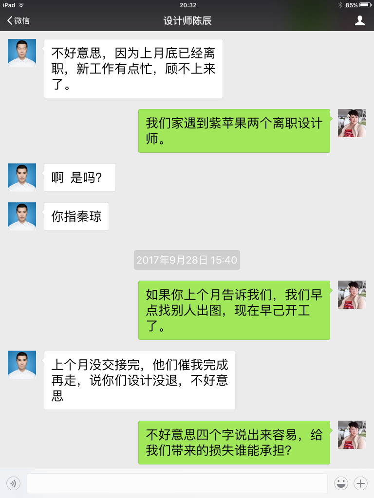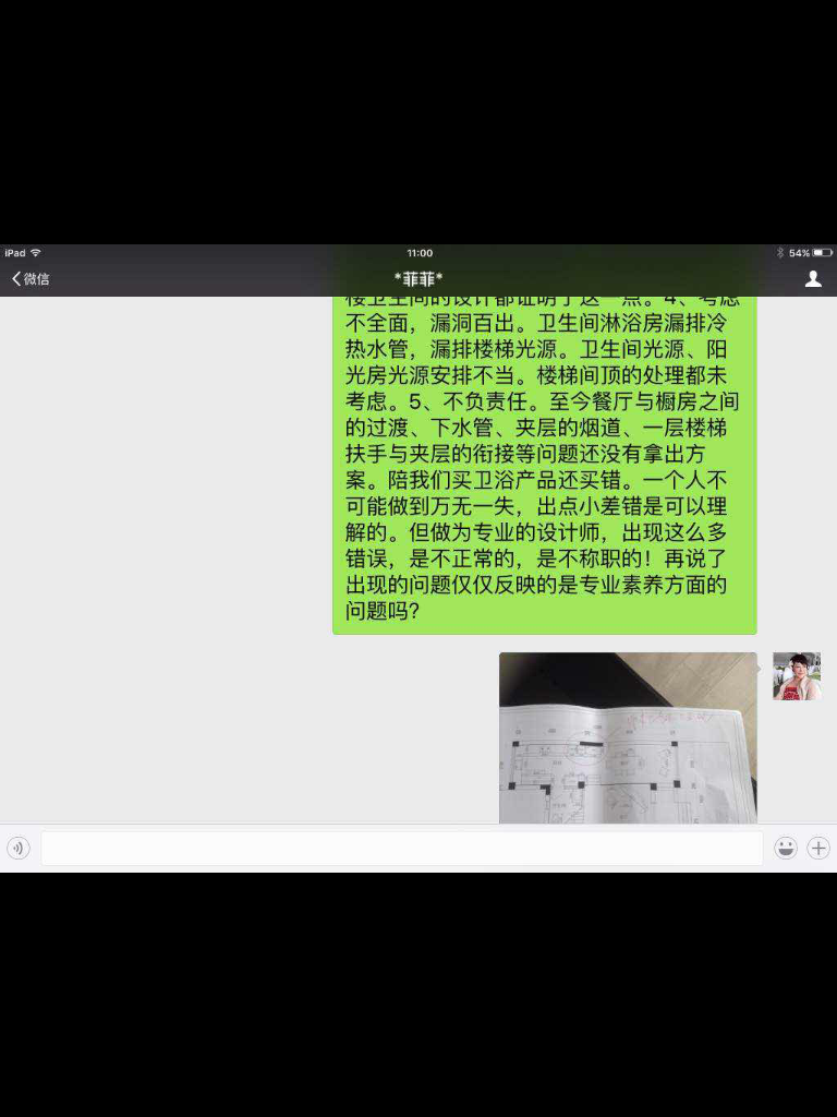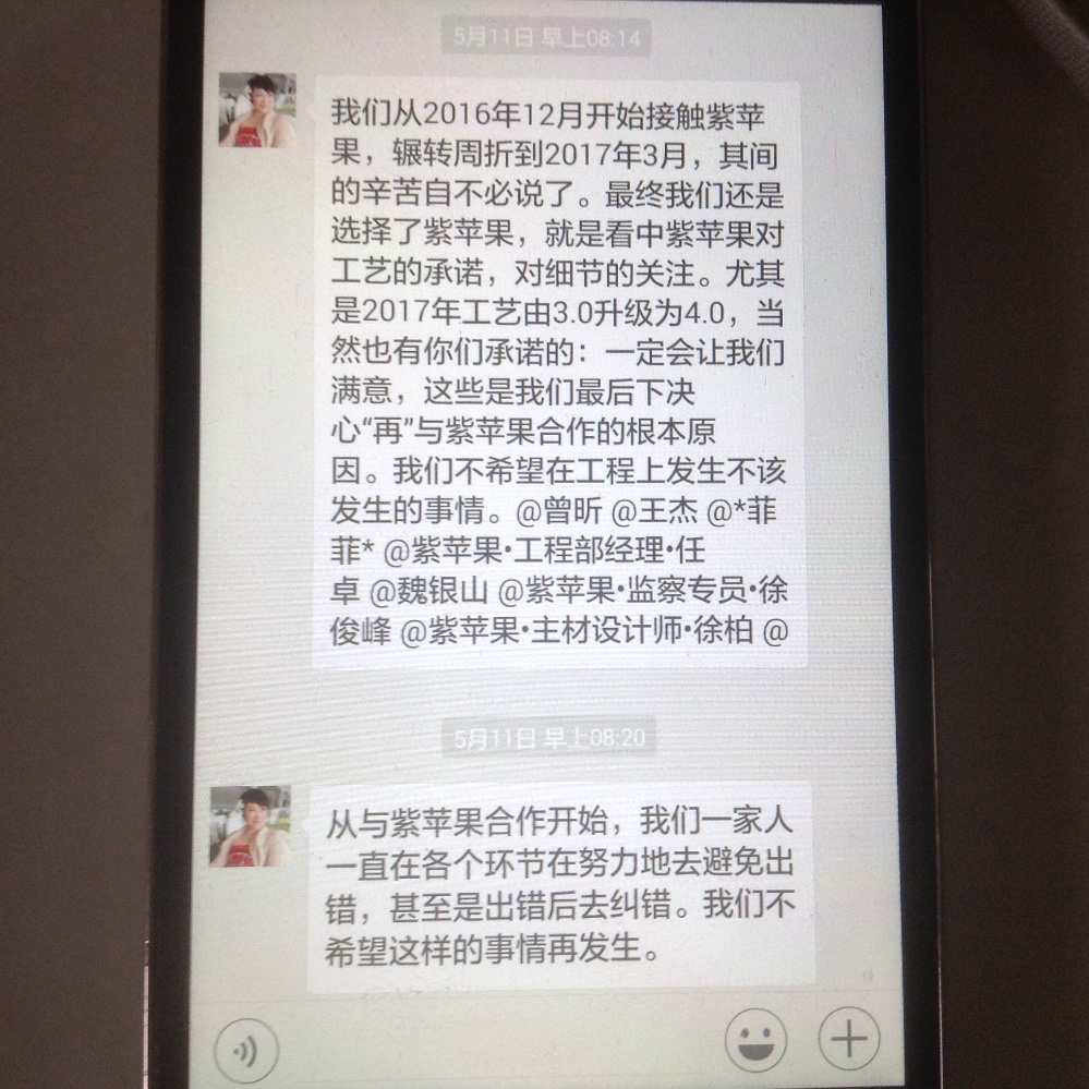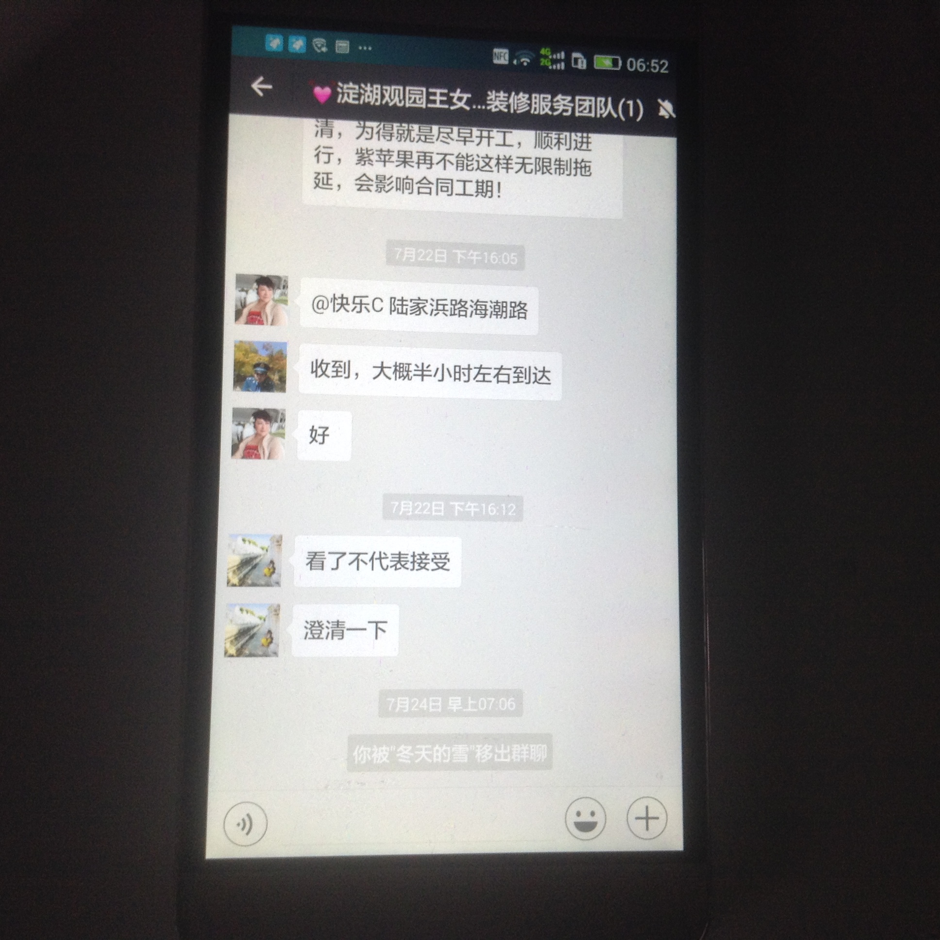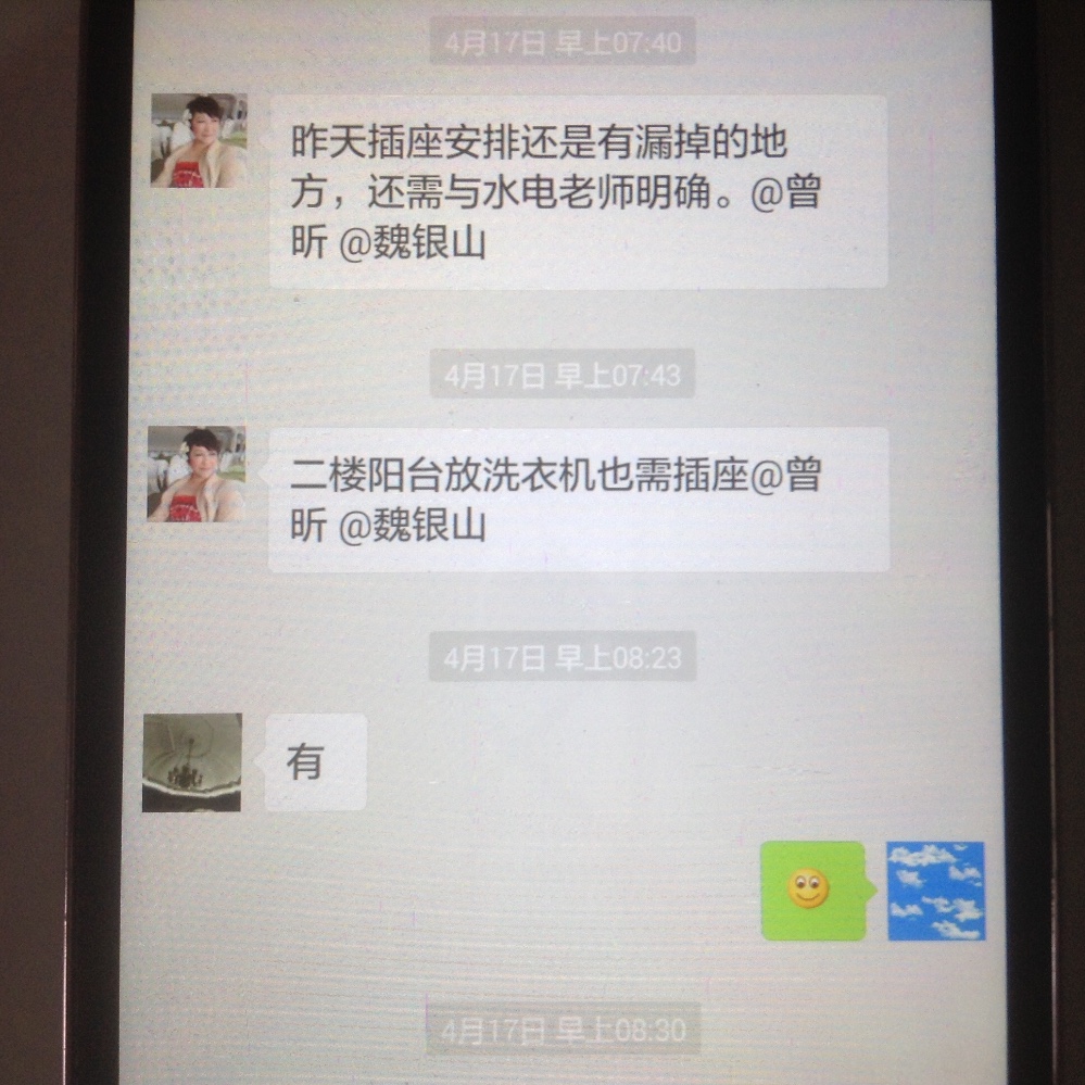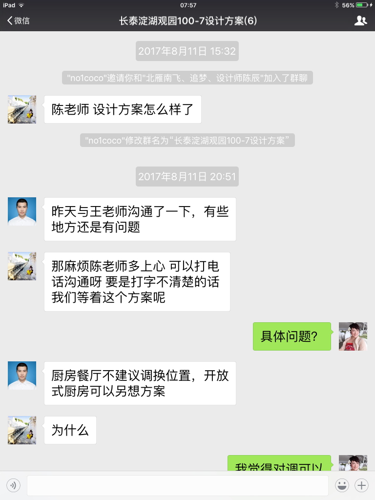 從施工一開(kāi)始,我們發(fā)現(xiàn)設(shè)計(jì)圖有問(wèn)題時(shí),就在群里表達(dá)了我們的看法,擔(dān)心有看不到的潛在風(fēng)險(xiǎn)發(fā)生。隨著工程的推進(jìn),我們不斷發(fā)現(xiàn)這樣或那樣的問(wèn)題,更加重了我們的擔(dān)憂。我們?cè)B續(xù)六天在與客戶經(jīng)理、設(shè)計(jì)部經(jīng)理的群里反映問(wèn)題、表達(dá)我們的述求,但沒(méi)人出來(lái)解決問(wèn)題,他們采取了不理不睬的態(tài)度,施工照常進(jìn)行。再后來(lái)我們將問(wèn)題直接反映給公司高層后。讓我們感到不可思議的的是紫蘋果公司高層解決問(wèn)題的方法卻是增加項(xiàng)目?jī)r(jià)款。由原來(lái)的28萬(wàn)多提到36萬(wàn)多。實(shí)際就是將紫蘋果自身過(guò)錯(cuò)造成的損失變相轉(zhuǎn)嫁到我們身上。3月17號(hào)簽合同,工期180天。正常情況下,9月16號(hào)應(yīng)該完工??勺咸O果從5月18號(hào)就將水電做到一半的工地停工,換了陳姓設(shè)計(jì)師,說(shuō)完善圖紙??蓤D紙我們一直沒(méi)拿到,問(wèn)題到現(xiàn)在還未解決。