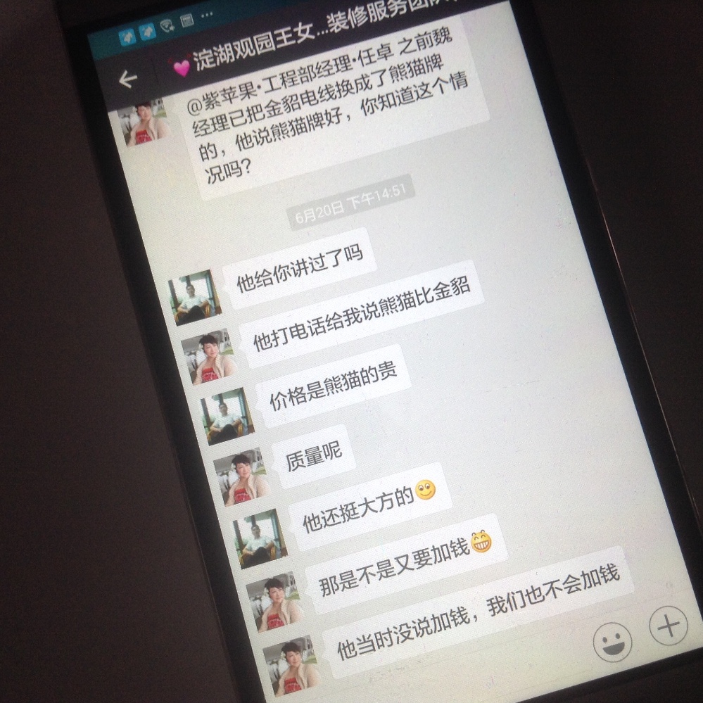 在施工過(guò)程中,我們發(fā)現(xiàn)電工師傅的家屬在電箱處操作電線的鋪設(shè)工作。當(dāng)我們提出質(zhì)疑時(shí),施工經(jīng)理說(shuō):現(xiàn)在裝修公司聘工人都是連家屬一起聘的。電工的家屬也是被紫蘋果聘用的人員,公司都給她交了五險(xiǎn)一金了。我們讓公司提供電工家屬也是公司員工的相關(guān)資料,他們沒(méi)有提供。