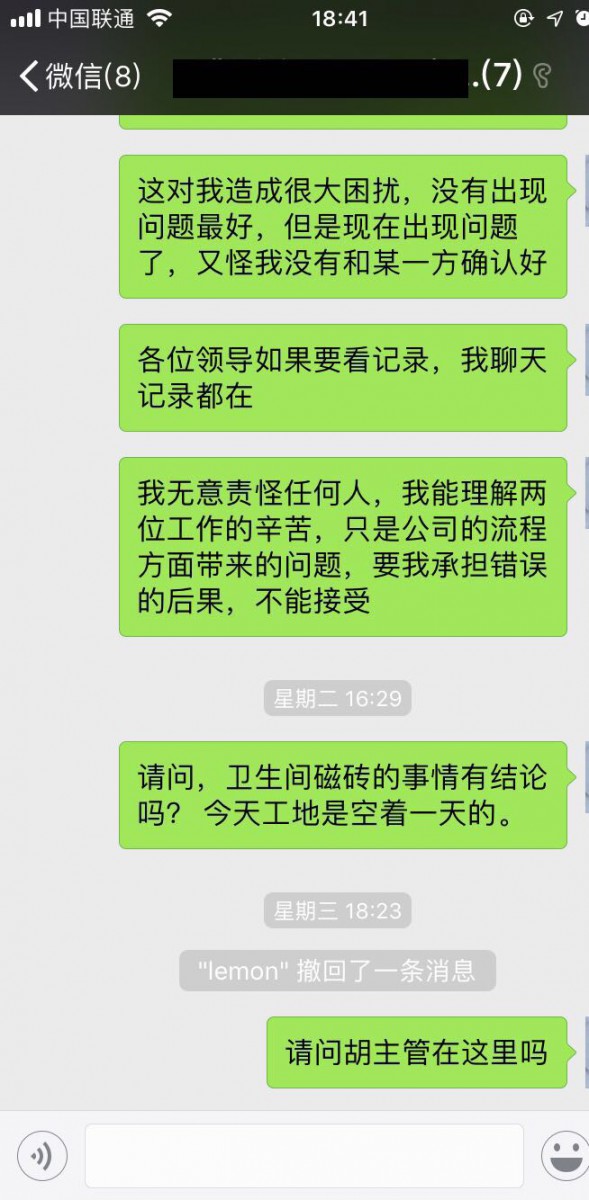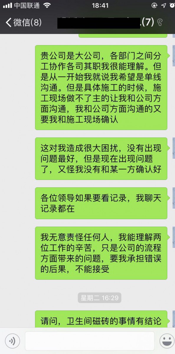 現(xiàn)在,裝飾公司沒有任何人回應(yīng)此事,與設(shè)計(jì)師及相關(guān)領(lǐng)導(dǎo)微信、電話均無人回應(yīng),對(duì)施工問題視而不見,欺騙業(yè)主。