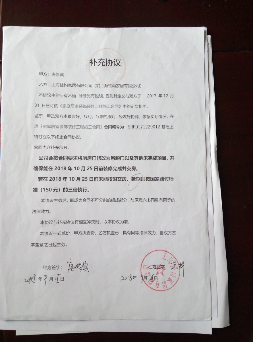 | 投訴類型 | 施工拖延 | 投訴人 | 唐** | 被投訴單位 | 上海繪尚家居有限公司 |
