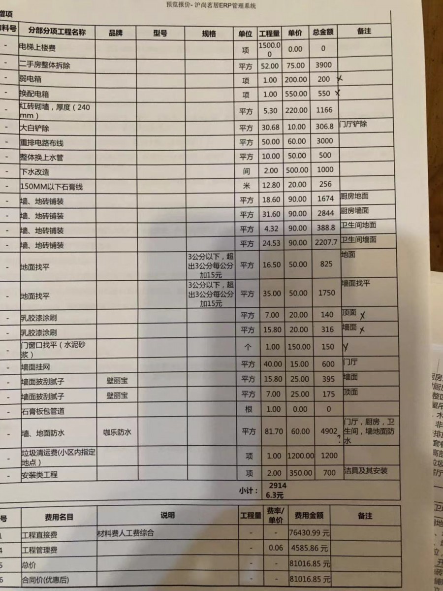 4. 廚房櫥柜,承諾用的是E0級(jí)板材(說工廠只有這個(gè)級(jí)別的),當(dāng)然收費(fèi)也是按E0級(jí)收的。結(jié)賬時(shí)要求書面明確板材級(jí)別時(shí),孫飛居然說我在搞事情,在向售后投訴之后,負(fù)責(zé)櫥柜生產(chǎn)的告知是用E1級(jí)的。土建結(jié)賬居然按照一個(gè)房間的打包價(jià)來結(jié),另存在重復(fù)計(jì)費(fèi),每次給出的造價(jià)表,科目、報(bào)價(jià)格式都不同。