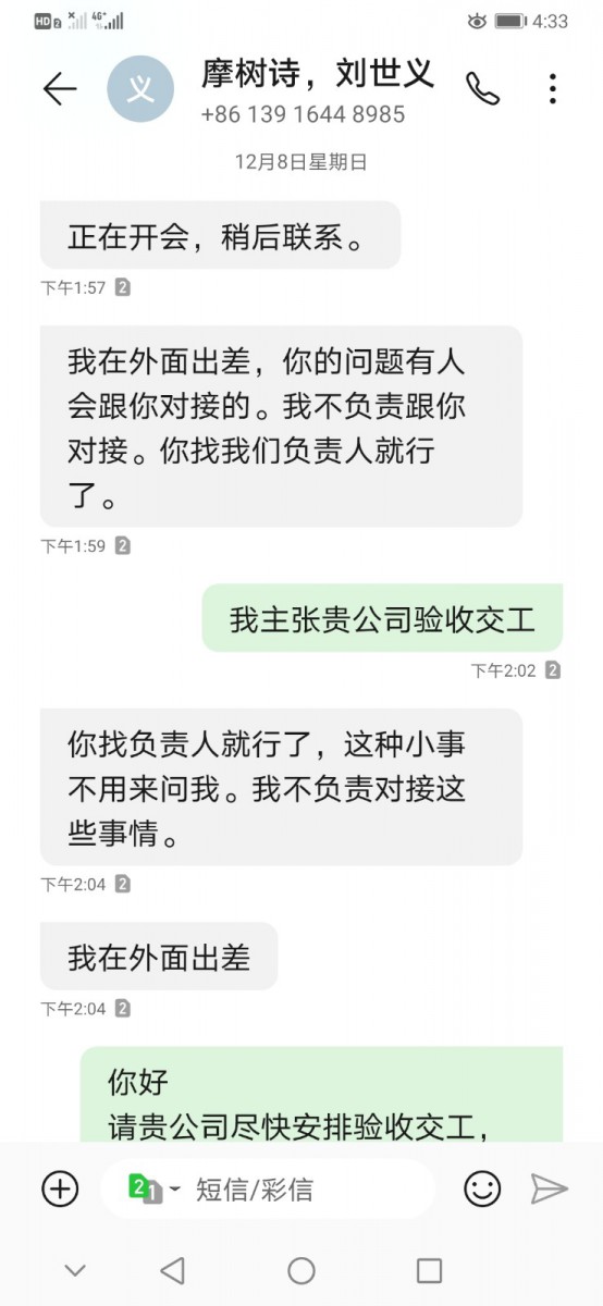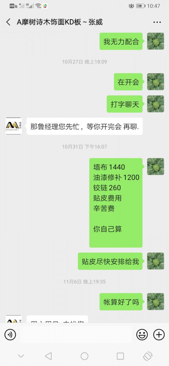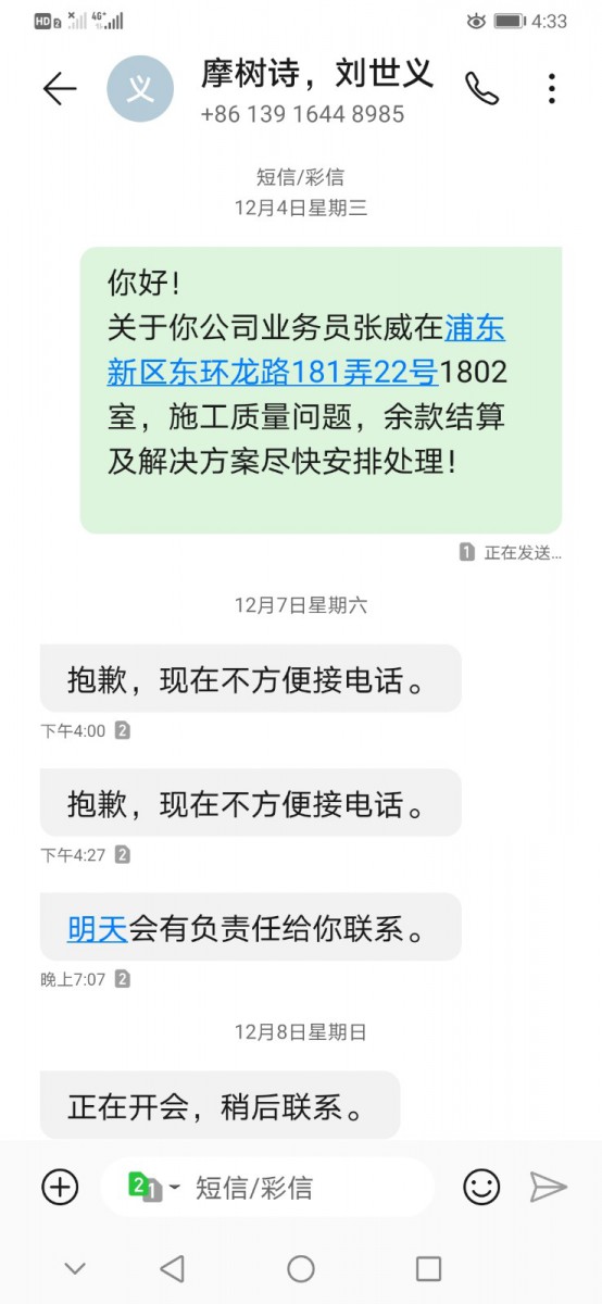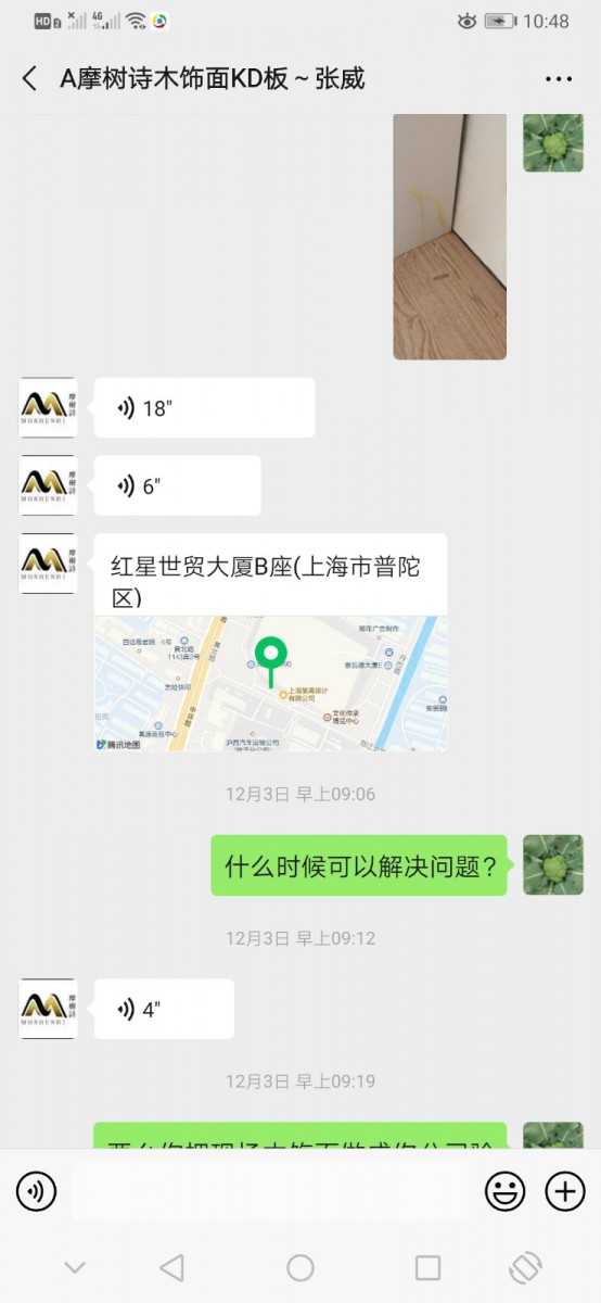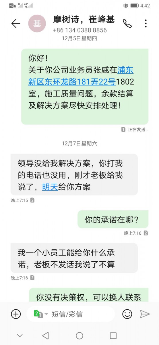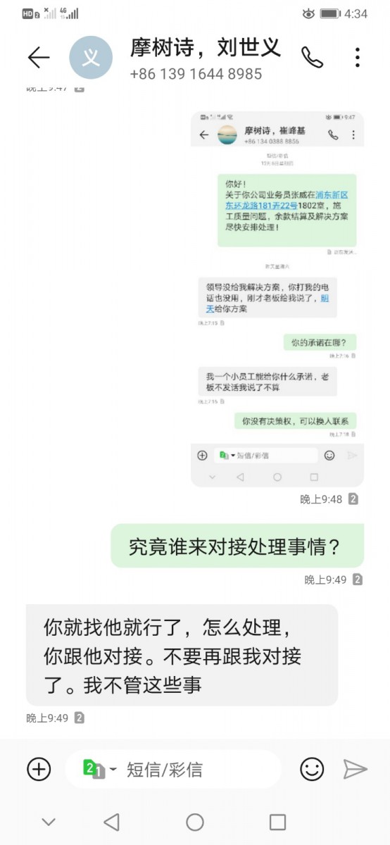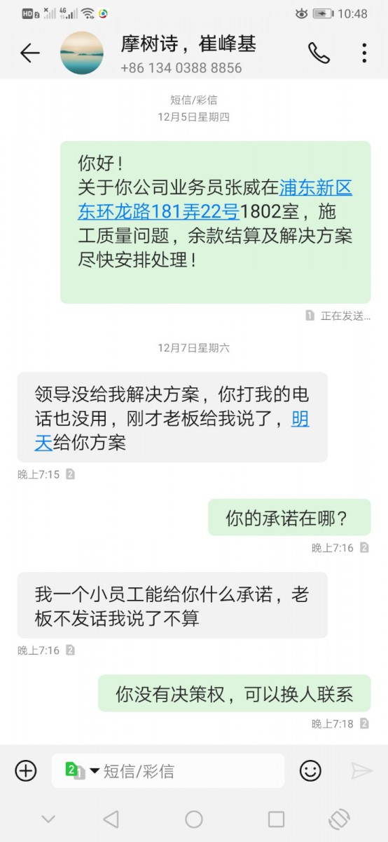 | 投訴類型 | 施工質(zhì)量 | 投訴人 | 魯** | 被投訴單位 | 上海摩樹詩(shī)裝飾材料有限公司 |