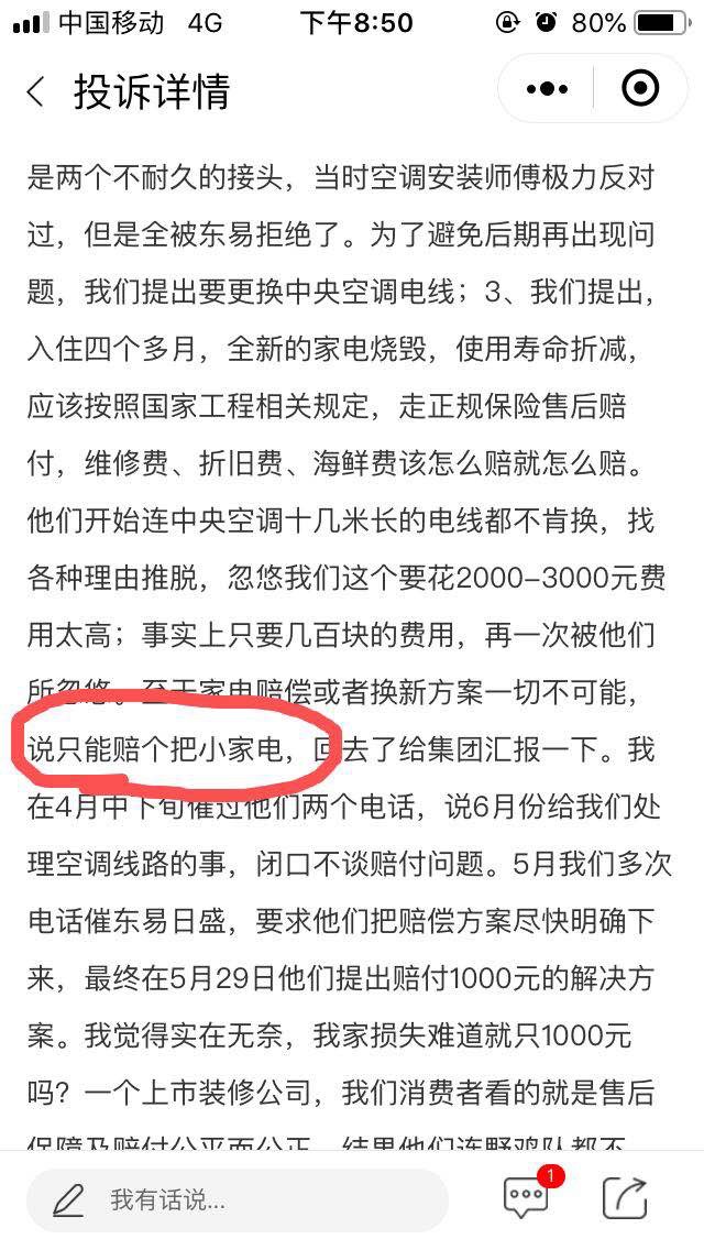 他們開始連中央空調(diào)十幾米長的電線都不肯換,找各種理由推脫,忽悠我們這個要花2000-3000元費用太高;事實上只要幾百塊的費用,再一次被他們所忽悠。至于家電賠償或者換新方案一切不可能,說只能賠個把小家電,回去了給集團匯報一下。我在4月中下旬催過他們兩個電話,說6月份給我們處理空調(diào)線路的事,閉口不談賠付問題。5月我們多次電話催東易日盛,要求他們把賠償方案盡快明確下來,最終在5月29日他們提出賠付1000元的解決方案。我覺得實在無奈,我家損失難道就只1000元嗎?一個上市裝修公司,我們消費者看的就是售后保障及賠付公平而公正,結(jié)果他們連野雞隊都不如,既要做婊子,還要立牌坊!