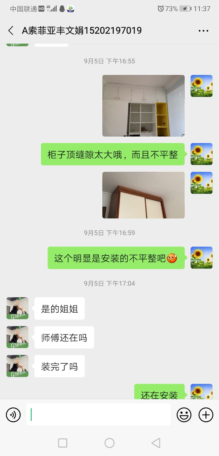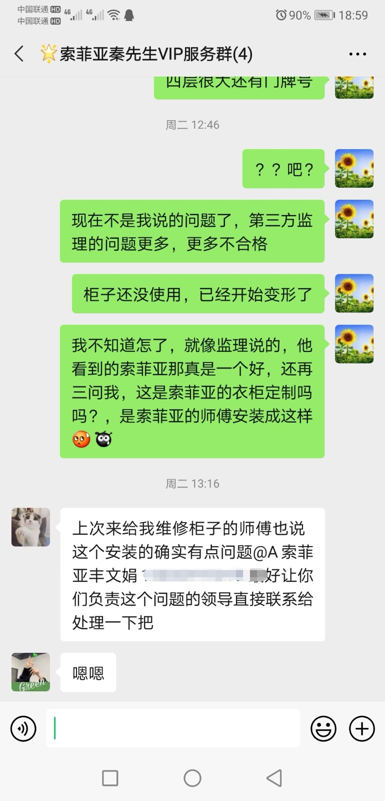總價是27614元,然后9月5日安裝,兩個衣柜,兩個書柜,一個鞋柜。安裝當時來了三個師傅,安裝第一個衣柜,我就發(fā)現(xiàn)衣柜安裝有問題,縫隙不平整,與現(xiàn)場師傅溝通,他說這是符合標準尺寸的,會有什么熱脹冷縮等,然后我拍照發(fā)圖給盆友,他說不對的,說師傅在忽悠我,讓我找銷售立馬換一個好的師傅上門調(diào)節(jié)安裝,不要再讓這個師傅安裝了。我給銷售反應 他沒有換師傅,而且只是查了誰來我家安裝,然后說把衣柜安裝好一點。到天黑,我看見還是哪些師傅,而且所有柜子也安裝完了,除了鞋柜看著還行,其它安裝都很丑,讓師傅調(diào)節(jié),他說沒法調(diào)節(jié),這是符合標準的,還說墻面不平整,然后還態(tài)度很不好的說我,說他們都沒安裝完給銷售打什么電話。天黑,他們安裝完就拿單子給我簽,不簽三個師傅不走,我老公說,師傅也辛苦一天了,簽了。再找銷售,他說他來處理,他找公司 然后就到售后了,來了一個售后,聽說是經(jīng)理,他也說安裝對的,正常縫隙符合標準,我說不可能,然后售后開始不耐煩了,發(fā)火,對我大吼,大聲,語氣很不好的,當時安裝師傅書桌位置有很大的縫隙,上下不平整,為了遮丑,墻面弄了一塊板子遮丑,他拆墻體的時候很猛烈的,把我一塊墻面也搞花了。。然后說9.20日來維修換板,之后售后就走了,也打電話道歉,說剛才服務不好怎么樣等,再就是談到賠償,售后說他們不會搗漿糊,該怎么賠償怎么賠償,可最后只說賠償1300,還求求我說,這是他最大的權(quán)限了,扣工人師傅工資,再送我兩套禮品,碗。我沒有同意,因為衣柜書柜都安裝的很丑,不滿意,而且總價小三萬,才理賠這么一點。我也不是無理取鬧,衣柜安裝好 安裝到門道的效果,我怎么會要賠償,最開始發(fā)現(xiàn)安裝不好就反應了,但是商家不積極處理,沒有措施,然后一直拖到國慶,一個多月了,我在裝潢群發(fā)過衣柜的照片,都說安裝是不好,徐監(jiān)理也說,該扣錢。我盆友圈也發(fā)了,好多都說安裝的丑,收口狗啃一樣師傅手藝不好,索菲亞冒牌等。昨天去門店找店長談,他也說安裝都會有縫隙,不平整的,就是收口問題,換板子就好了,說的很輕松很淡然,,我就不明白了那為何一開始不給安裝好,然后我說到投訴,他根本不怕的,說隨便我投訴好了,找315消協(xié)會,找律師,他們配合工作。衣柜價格不便宜,安裝手藝一般般,我房租貴啊,一個月三千,多租兩個月房子,對我造成損失也沒有誠意不補償我墻面重新刷油漆,索菲亞的工作人員說沒有事情,不用空關(guān),可以直接入住的,說話一點也不負責任的,都知道油漆有甲醛,需要自然通風,空關(guān),完全不替顧客考慮,不為自己的錯誤買單。請裝潢網(wǎng)幫我主持公道,謝謝(*°?°)=3