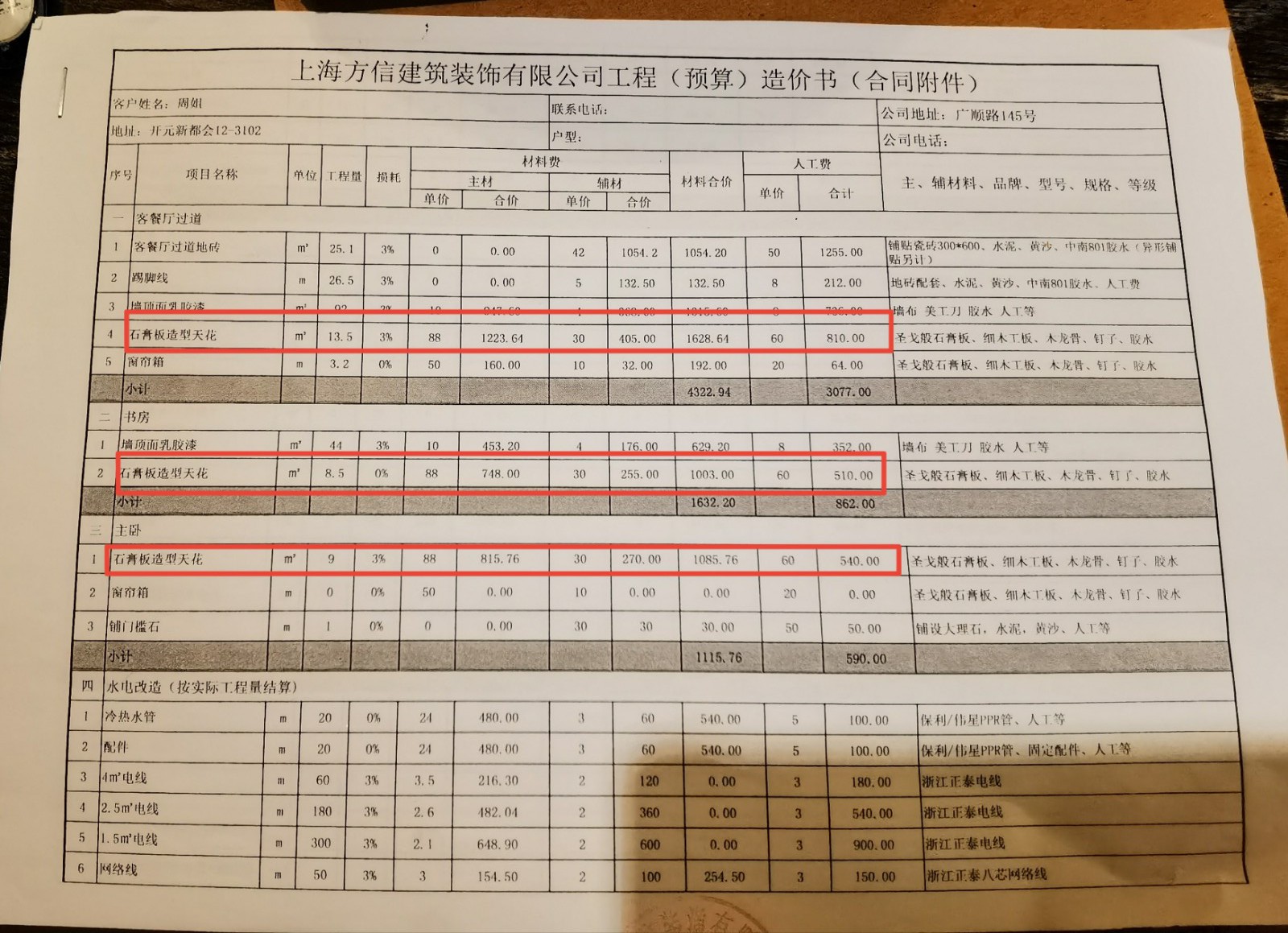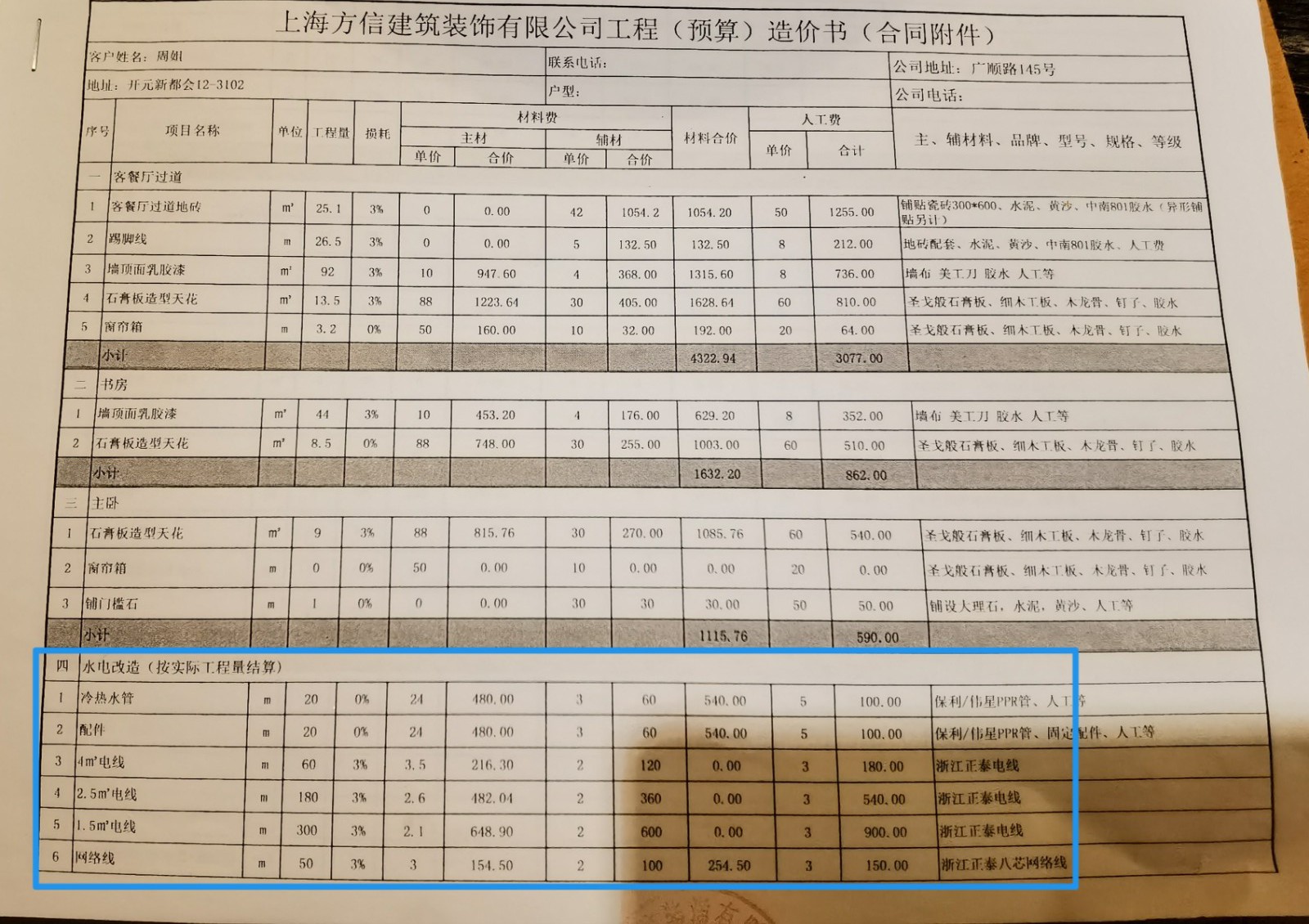 糾紛一:設(shè)計(jì)圖由上海方信裝飾有限公司海寧分公司出圖,按確認(rèn)圖紙報(bào)價(jià),后期并未增加大的變更。哪會(huì)額外多出26000多的費(fèi)用。(后期報(bào)價(jià)中,光水電線路附加就高達(dá)15000多元。)