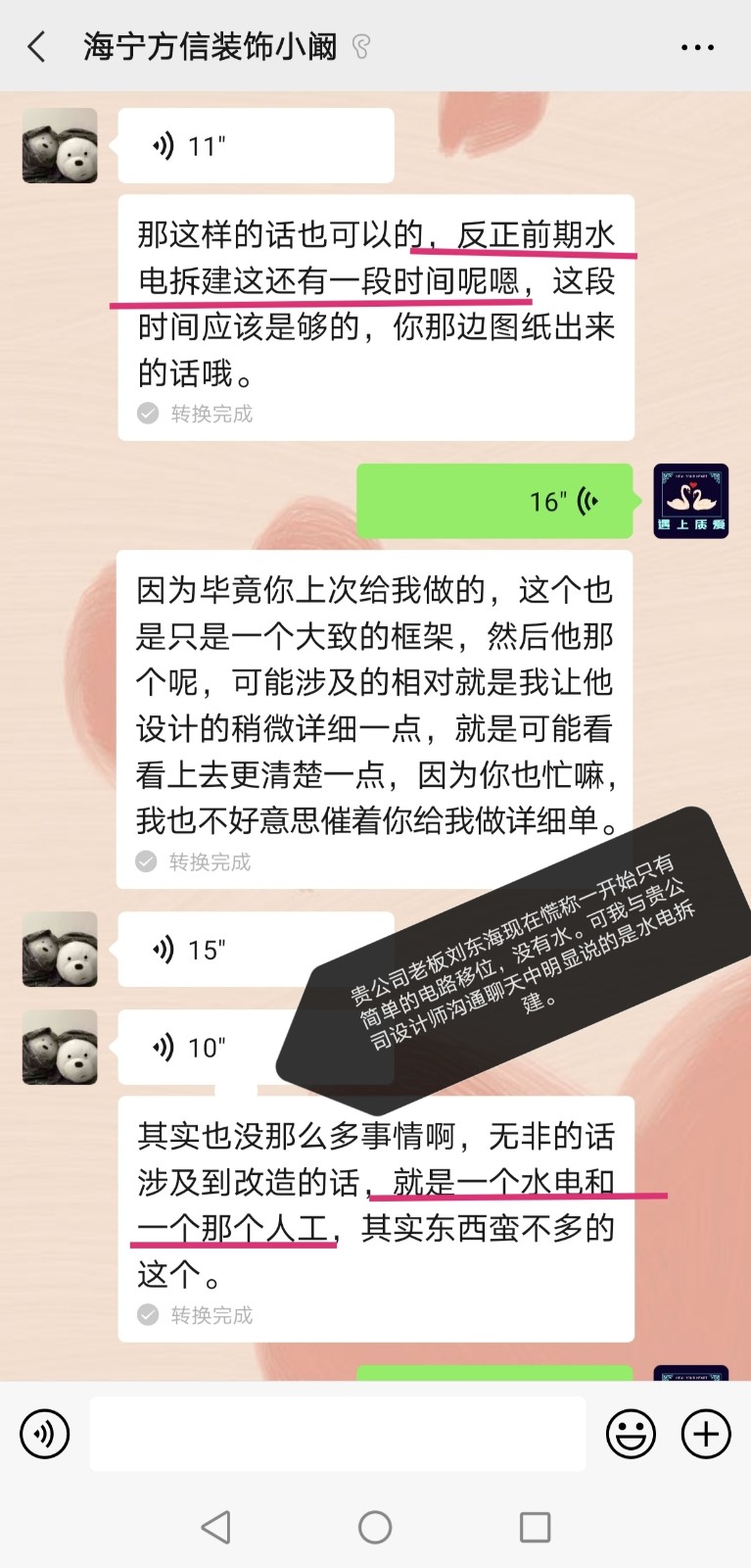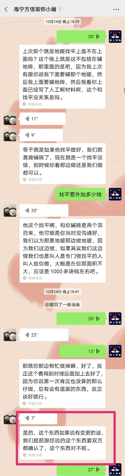 糾紛二:即使有加單,也該提前溝通,提前報(bào)價(jià),但是上海方信裝飾有限公司海寧分公司在未對(duì)我提起,也未經(jīng)過我同意的情況下,突然提出附加了多少東西,我無法認(rèn)可。