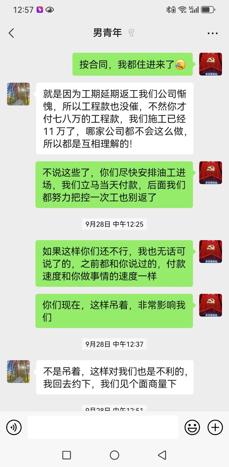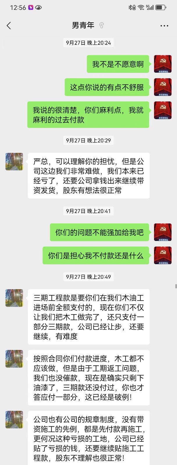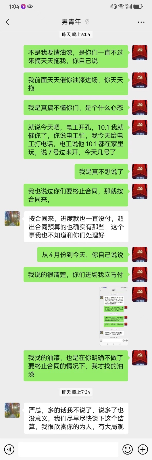 7、合同存在霸王條款,合同要求每個(gè)工種進(jìn)場(chǎng)前付款,最后一次與裝修公司協(xié)商,油漆工進(jìn)場(chǎng)當(dāng)天立馬付款,裝修公司不同意,單方面違約,也不做驗(yàn)收與收尾。