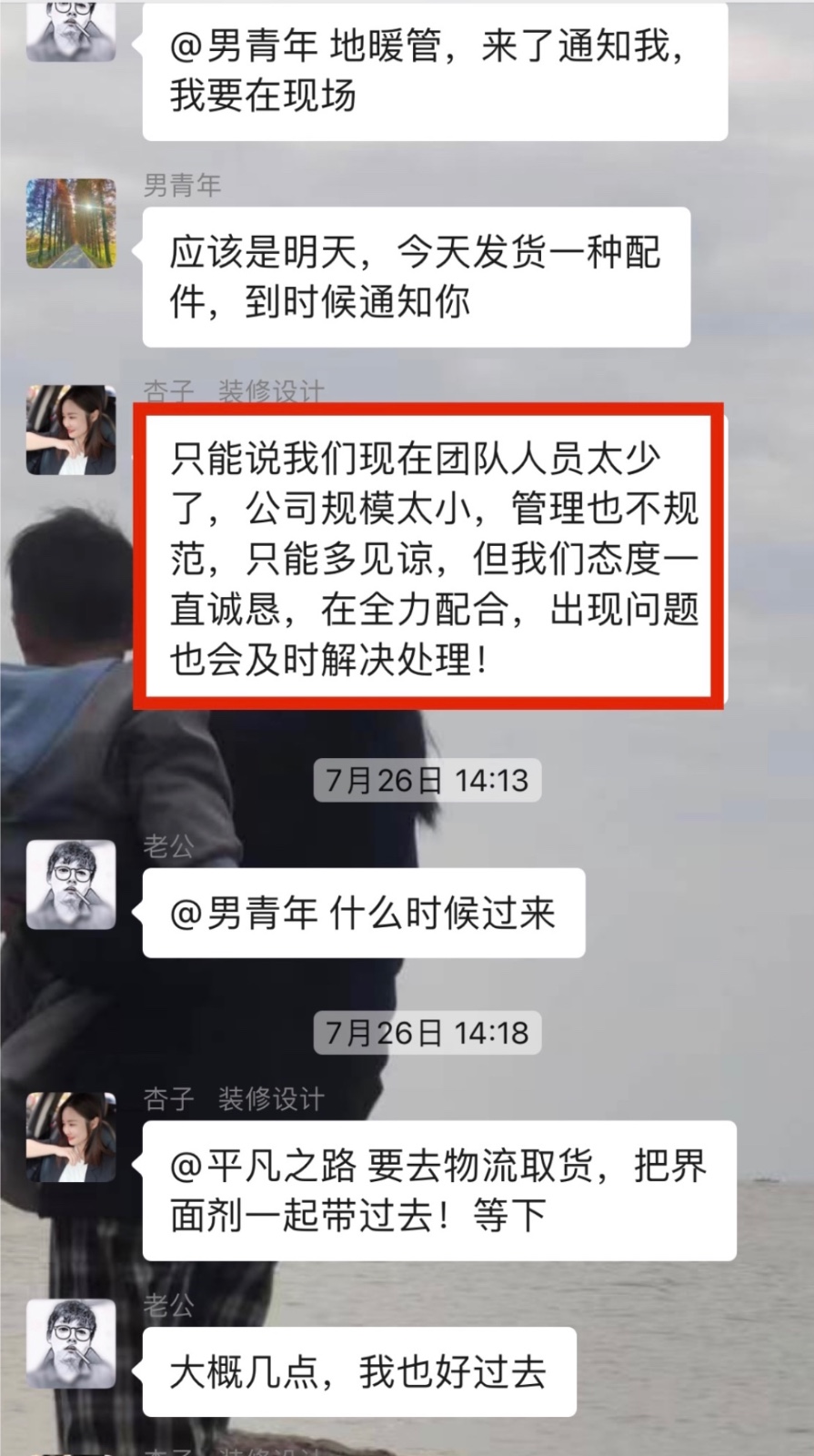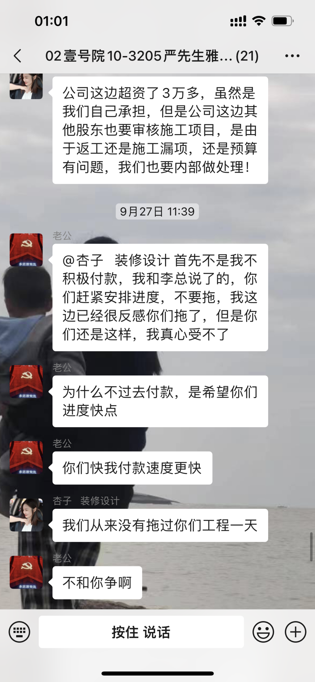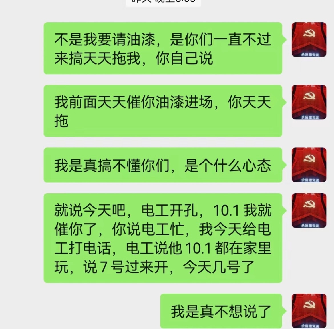 3、9月24日我在群里反應(yīng)電工開(kāi)燈孔開(kāi)一開(kāi)就在龍骨下面,沒(méi)辦法繼續(xù)開(kāi),10月4號(hào)裝修公司單方面終止合同,我們要求電工過(guò)來(lái)開(kāi)燈孔,對(duì)方推三阻四就是不來(lái)。