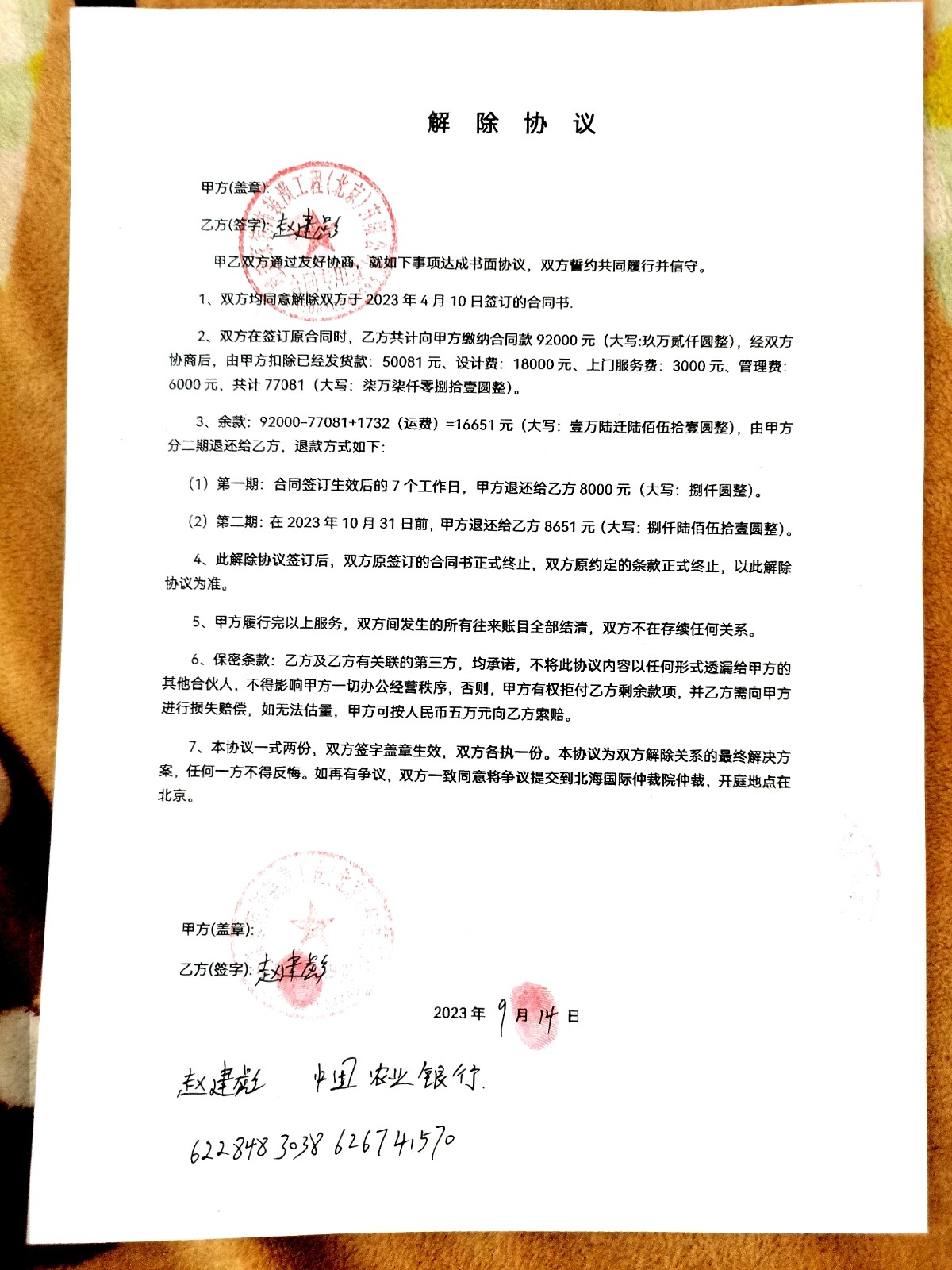 后來和大廳銷售唐經(jīng)理開始談裝修的事兒,它說全屋整裝,正好它們?nèi)砍邪?,拎包入住,?dāng)時(shí)我裝修房子大約二十萬左右、它答應(yīng)我一個(gè)一百四十平方的二層樓、和一個(gè)七十多平方的地下室當(dāng)做它們的樣板間全部免費(fèi)給裝上、(包括床、沙發(fā),貴子,辦公桌椅、和會(huì)議桌椅還有電器等)施工隊(duì)也是北京的,所有費(fèi)用不用我管.我交的145000元都是裝修全款,所有的貨都比我個(gè)人進(jìn)貨便宜很多,所有運(yùn)費(fèi)全有公司承擔(dān),我的往僅路費(fèi)和當(dāng)時(shí)還抽獎(jiǎng)抽了500元,說不返現(xiàn)金都給貨 ,當(dāng)時(shí)還說送一個(gè)電視也給我郵回來,到家等了幾個(gè)多月,抽的電視也不見蹤影。過了幾天他們建了一個(gè)裝修對(duì)接群。三個(gè)多月就發(fā)來了點(diǎn)瓷磚、運(yùn)費(fèi)也是我自己付的,他們說到后期運(yùn)費(fèi)都給材料,看進(jìn)貨單上的價(jià)格得貴三分之一,瓷磚到了我問要施工了你們?yōu)樯恫粊砣?,說太忙,讓我找人干活,它們給施工補(bǔ)助,沒辦法我就找人干了,六個(gè)多月去了,只有一個(gè)一百多平方的瓷磚發(fā)過來就完事兒了,后續(xù)什么都沒有了,一共加一起按他們的價(jià)格還不到三萬,其余的東西一直推,今天說明天發(fā)貨,明天還是這么說,