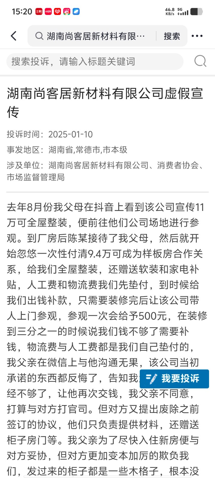 ? ?意思就是我花了12萬(wàn)3千現(xiàn)在只買(mǎi)了一些墻磚,地磚,墻板,本來(lái)想著省事省錢(qián)找的裝修公司,沒(méi)想到貪便宜吃大虧遇上了高價(jià)賣(mài)材料的詐騙公司,現(xiàn)在公司不給錢(qián)就不發(fā)貨,還辱罵我說(shuō)揚(yáng)言要打我,像我一樣被這個(gè)園區(qū)誘騙上當(dāng)?shù)娜诉€有很多,但是打電話給12345市場(chǎng)監(jiān)督管理局卻一點(diǎn)用都沒(méi)有,投訴無(wú)門(mén),申請(qǐng)你們立案調(diào)查,還我們一個(gè)公道。