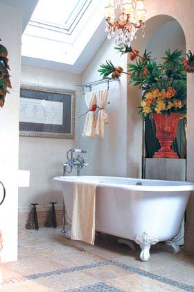衛(wèi)浴空間選用整體的套間潔具,線條柔和簡約,潔具、浴缸、手盆柔和的邊角和光滑的表面,非常具有質(zhì)感。浴鏡的邊框是用枝葉手編的,呈花環(huán)狀,充滿浪漫氣息。美式衛(wèi)浴就是這樣,他們非常注重衛(wèi)浴這個(gè)隱私空間的質(zhì)感和舒適度。樣板間的干濕分離、潔具光潔的釉面和新型的設(shè)計(jì),沿著斜屋頂搭建的浴缸等都體現(xiàn)了他們追求舒適的心理期待。