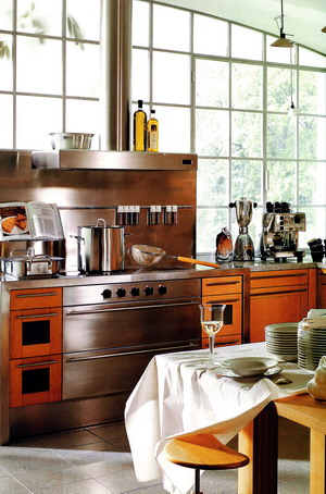 通體發(fā)亮的不銹鋼櫥柜透露出強烈的后現代特征,當從這樣的廚房中端出一盤盤美味食蔬,就好像經過工業(yè)化的精密鑄造一樣,既清爽又縝密。