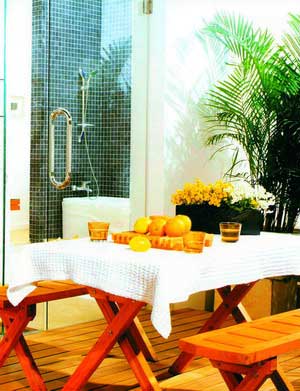 這個空間關(guān)鍵的地方不在裝修,而是浴室本身是否具備這樣條件的空間:它必須是朝南的,而且前面比較空曠,保證一年四季有大量陽光可以進(jìn)入室內(nèi)。