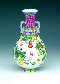 還有有彩瓷皇后之稱的琺瑯彩,曾經(jīng)是皇宮里制成的極為名貴的宮廷御用瓷器,品種少、產(chǎn)量少、質(zhì)地精,傳世品均秘藏宮苑,一般人難于見到。這種創(chuàng)燒于康熙時期的彩瓷,其工藝一度是個謎,記得著名收藏家馬未都先生曾經(jīng)說過:“瓷胎畫琺瑯彩,在1925年故宮成立以前,就沒人看見過,所以老百姓覺得它特神秘”。因此,近年來只要琺瑯彩瓷器在拍賣會上一露面,必遭到有實(shí)力買家的窮追不舍。去年,一件清乾隆御制的琺瑯彩“古月軒”題詩花石錦雞圖雙耳瓶拍出了一個多億。因此,高仿琺瑯彩瓷器也不是件容易的事,能夠見到燒制完美的高仿琺瑯彩瓷器也是一種榮幸。